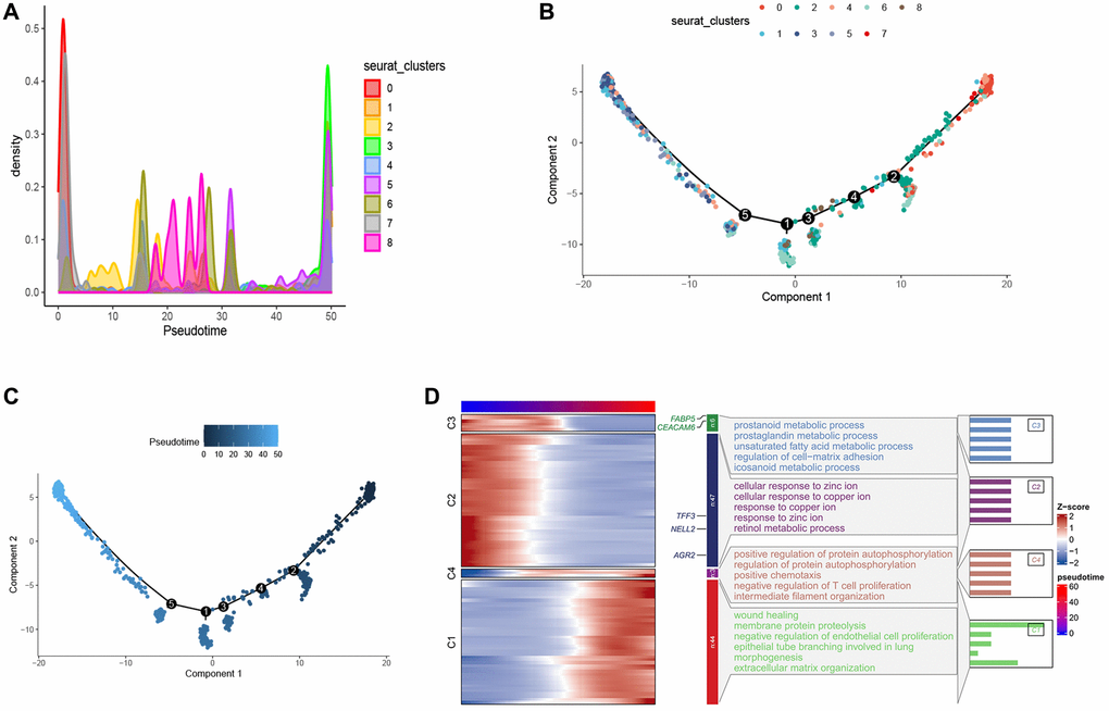 To explore the developmental timing and trajectory of esophageal tumor cells, we employed Monocle [9]. This powerful tool applies advanced algorithms to infer the sequential changes in gene expression that each cell undergoes as part of a dynamic biological process. By utilizing unsupervised or semi-supervised learning, Monocle constructs a trajectory of cells arranged in a simulated time sequence based on the input data. This enables us to gain insights into the developmental progression of esophageal tumor cells and understand the underlying molecular changes driving their differentiation.