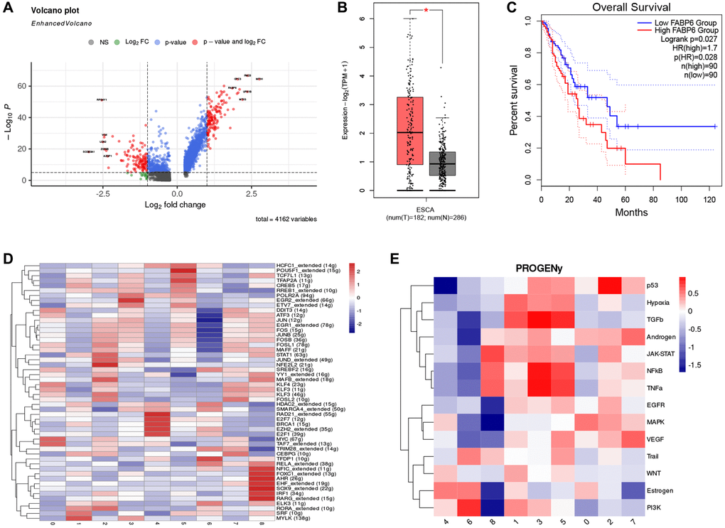 FABP6, identified as a defining marker for cluster 0, was found to be highly expressed in these tumor cells compared to normal epithelial cells. The analysis of the TCGA database confirmed higher expression of FABP6 in esophageal tumor tissue, and patients with high FABP6 expression exhibited poorer survival. The enrichment of transcription factors MYC and TAF7 in cluster 0, along with pathway enrichment analysis, revealed the activation of the MAPK pathway in these FABP6+ tumor cells. These findings suggest the potential involvement of FABP6 in regulating fatty acid metabolism and signaling pathways related to tumor progression. Regarding T cell infiltration in esophageal tumors, the analysis identified distinct subsets of T cells, including CD8+ effector T cells, NK T cells, exhausted T cells, T regulatory cells (Tregs), and naive T cells. Comparing tumor and normal tissues, the infiltration of Tregs was significantly increased, while CD8+ effector T cells showed a significant decrease in tumor tissues. Interestingly, no significant change was observed in exhausted T cell infiltration, suggesting that the efficacy of PD-1 may not be significant in esophageal tumors. This indicates that other factors or mechanisms may play a more influential role in the immune response and tumor microenvironment of esophageal tumors.