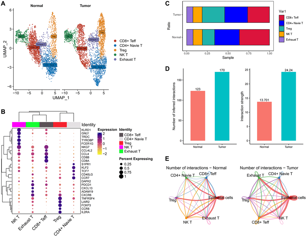 To investigate the infiltration of T cells in the microenvironment of esophageal tumors, we undertook a further classification of T cells into five distinct subgroups using unsupervised clustering techniques (Figure 5A). Among these subgroups, CD8+ effector T cells (CD8+ Teff) displayed heightened expression of NKG7, CD8A, and CD8B; NK T cells exhibited increased expression of KLRD1, GNLY, and FCER1G; Exhausted T cells (Exhaust T) demonstrated elevated expression of PDCD1 (PD-1); T regulatory cells (Treg) displayed enhanced expression of FOXP3 and IL2RA; Naive T cells (Naive T) exhibited pronounced levels of TCF7 and CCR7. These findings align with previous literature reports (Figure 5B). We conducted an analysis of T cell infiltration by assessing the ratio of T cells, which revealed a substantial augmentation in Treg infiltration and a notable reduction in CD8+ effector T cells (CD8+ Teff) within tumor tissues, in comparison to normal tissues (Figure 5C).