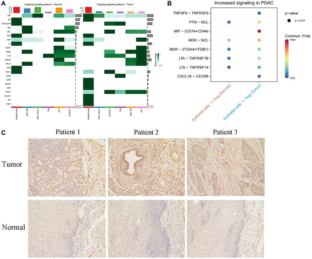 We proceeded to analyze the cellular communication output signal patterns of these cells. Interestingly, we observed a significant decrease in the CXCL-related pathway in FABP6+ tumor cells compared to normal tissues (Figure 6A). The CXCL family of cytokines plays a crucial role in tumor metastasis and invasion. Cytokines such as CXCL8, CXCL9, and CXCL10 are capable of attracting and activating immune cells, including macrophages and lymphocytes, causing their accumulation around the tumor. Through the release of substances that can dissolve tumor cells, these immune cells can limit the spread and dissemination of the tumor [105–107]. CXCL9 and CXCL10, by binding to their receptor CXCR, can attract and activate anti-tumor immune cells such as CD8+ T cells and natural killer (NK) cells, thereby enhancing their ability to eliminate tumor cells [108, 109]. Compared to FABP6+ tumor cells, normal tissues were found to lack the MIF-related pathway in our analysis of cellular communication output signal patterns. This suggests that the communication signals involving MIF may be absent or downregulated in normal tissues. The differential presence or absence of the MIF-related pathway between FABP6+ tumor cells and normal tissues highlights a potential role of MIF signaling in the tumorigenic processes associated with FABP6+ tumor cells. In order to further explore the specific receptors involved in the MIF pathway in FABP6+ tumor cells, we conducted an analysis and found a significant enrichment of CD74 and CD44 receptors in the tumor tissue (Figure 6B). MIF, CD74, and CD44 exhibit interplay and mutual regulation mechanisms in tumor development and progression. In addition to its expression in immune cells, CD74 is overexpressed in various tumor types and can form a complex with MIF, thereby modulating MIF’s function [110–112]. The interaction between MIF and CD74 can enhance the stability and biological activity of MIF, influencing tumor development and progression [113]. CD44, a cell surface molecule, is widely expressed in multiple cell types, including tumor cells. Elevated expression of CD44 in tumors is associated with characteristics of tumor stem cells, cell migration, and infiltration processes [114–117]. CD44 in tumors may interact with MIF and CD74, participating in the regulation of related signaling pathways [118–121]. Specifically, MIF can activate downstream signaling pathways such as MAPK (Mitogen-Activated Protein Kinase) and PI3K (Phosphoinositide 3-Kinase) by binding to CD74, promoting tumor cell proliferation, survival, and metastasis [113, 121]. Furthermore, the high expression of CD74 can also impact the expression and function of CD44. The interaction between CD74 and CD44 may influence tumor cell behavior through the regulation of cell-matrix interactions, cell adhesion, migration, and infiltration pathways [119, 120]. Existing studies have found that, TGF-β expressing B lymphocytes assembled into clusters and engaged with T cells through lymphocytic recruitment signals (SELL, CXCL13, CCL4, CD74), while interacting with regulatory T cells via CD47:SIRP-γ and FOXP3 promoting Galectin-9:CD44 pathways. This suggests that FABP6+ tumor cells may utilize CD74 to interact with CD44 on Treg cells, potentially promoting the immunosuppressive function of Treg cells and facilitating tumor development. This observation highlights the potential role of the CD74-CD44 interaction in modulating immune responses within the tumor microenvironment and provides insights into the mechanisms underlying immune evasion and tumor progression.