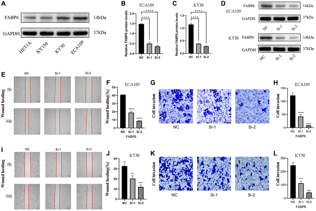 To elucidate the role of FABP6 in ESCA, we initially selected ECA109 and KYSE30 cell lines based on western blotting tests to establish si-FABP6 cell lines (Figure 7A). Subsequently, we quantified FABP6 protein levels using RT-PCR and protein blotting techniques (Figure 7B–7D). Furthermore, we conducted wound-healing and transwell assays to investigate the impact of FABP6 expression on cell migration and invasion in ESCA (Figure 7E, 7G, 7I, 7K). Our results demonstrated that FABP6 knockdown significantly reduced the migration potential of ECA109 and KYSE30 cell lines (Figure 7F, 7H, 7J, 7L). In conclusion, our findings suggest that FABP6 may expedite the development of ESCA by augmenting the migratory potential of cells.