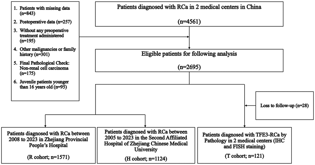 A set of inclusion and exclusion criteria was strictly formulated to screen eligible patients in two medical centers: (1) Enrolled cases with complete baseline information; (2) pathological examination: All paraffin section staining reports indicated renal cell carcinoma, and ambiguous pathological results were sent to immunohistochemical or fluorescent in situ hybrid (FISH) examination; (3) clinical data were collected preoperatively; (4) enrolled cases without any preoperative treatment; (5) patients with other malignancies or family history of RCa were excluded; (6) adult patients older than 16 years. The “R,” “H,” and “T” cohorts were remarked as the “Ra,” “Ha,” and “Ta” cohorts after rigorous screening above (Figure 1).