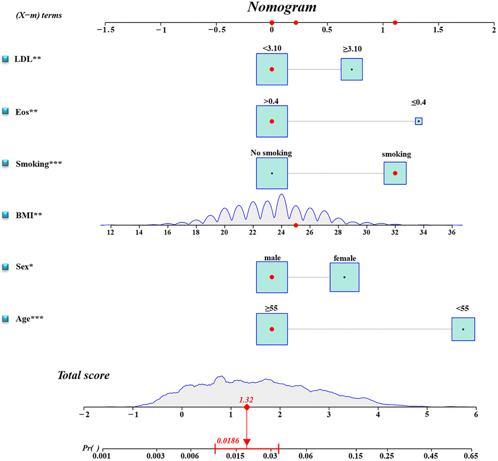 A binary logistic regression analysis was performed to screen for predictors of RCa in the Ra cohort. Univariate analysis revealed that younger age, female, high BMI, smoking, low EOS, and high LDL were significantly linked to TFE3-RCC diagnosis (Table 2 and Supplementary Table 2). The subsequent multiple logistic regression analysis included variables related to the TFE3-RCC diagnosis in the univariate analysis (Table 2). Therefore, a predictive model containing six variables was established (Figure 2).