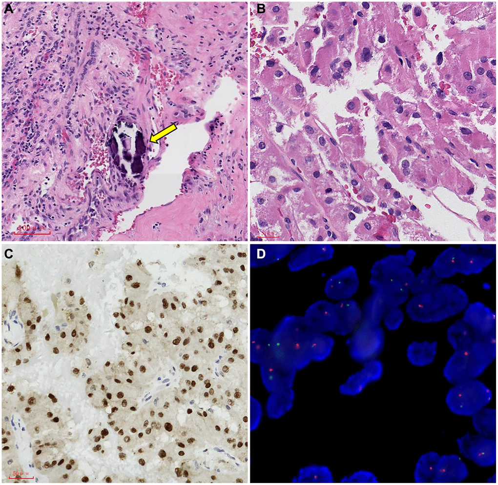 TFE3-RCC may grossly mimic conventional clear-cell RCC in HE staining. Immunohistochemistry tests (IHC) can distinguish them from conventional clear-cell cancers. The most distinctive IHC feature of TFE3-RCC is detectable nuclear staining for chimeric (mutant) TFE3 protein, which is absent in conventional clear cells. The IHC test has a diagnostic 97.5% sensitivity and 99.6% specificity [16, 17]. Based on the unique translocation of the TFE3 gene in Xp11.2 translocation renal cell carcinoma, fluorescence in situ hybridization (FISH) was used to design a TFE3 gene separation probe, which was specifically bound to the DNA fragments at both ends of the target gene TFE3 to display its location and detect its TFE3 in the tissue, to diagnose TFE3-RCC further [17, 18].