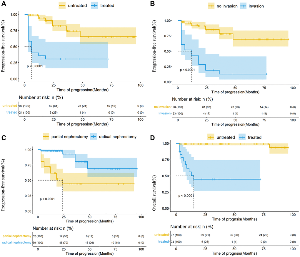 Age, pT staging, regional lymph node invasion, tumor necrosis or bleeding, tyrosine kinase inhibitors, and surgical methods significantly affected the progression outcomes. pT staging, regional lymph node invasion, tyrosine kinase inhibitors, and surgical method significantly affected the prognosis.