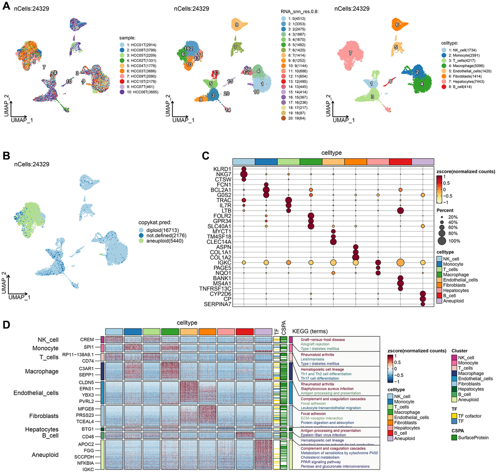UMAP dimensionality reduction analysis was performed on 24,329 cells using RunUMAP function, revealing the presence of eight cell types: B cell, Endothelial cells, Hepatocytes, Macrophages, Monocytes, NK cell, Fibroblasts, and T cells. Aneuploid cells were included in cell cluster marker identification for ten cell types. We further analyzed the 10 samples based on the proportion of the ten subpopulations and identified the location of aneuploid malignant cells on the UMAP (Figure 1B). The top-five marker genes with the most outstanding contribution in each subgroup are shown in Figure 1C, and the results of marker genes are provided in Supplementary Table 1. The differential gene enrichment analysis of each subpopulation of cells is shown in Figure 1D, and the aneuploid cells differential genes were mainly enriched in the complement and coagulation cascades, cholesterol metabolism, PPAR signaling pathway, and pentose and glucuronate interconversion.