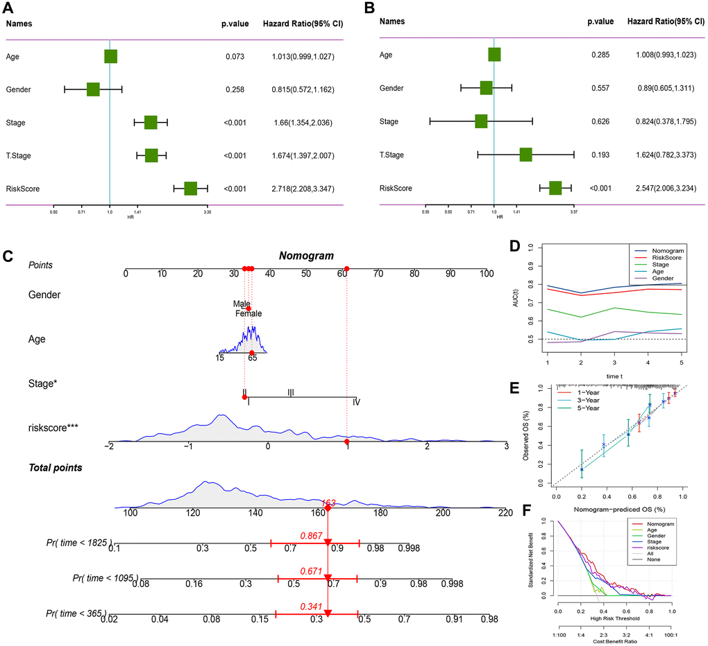 We demonstrated RiskScore as the most significant prognostic factor by performing univariate and multivariate Cox regression analysis on RiskScore and clinical characteristics, as shown in Figure 10A, 10B. To estimate the risk assessment and survival probability of patients, we integrated RiskScore with other clinicopathological characteristics to design a nomogram presented in Figure 10C. The results of the model showed that RiskScore had the most substantial impact on survival prediction. Moreover, we employed the Decision curve analysis (DCA) to evaluate the model’s reliability and observed that both RiskScore and Nomogram benefits were significantly higher than the extreme curve compared to other clinicopathological features. Both the nomogram and RiskScore demonstrated significant survival predictive power, as presented in Figure 10D, 10F. Additionally, we assessed the prediction accuracy of the model using the Calibration curve, illustrated in Figure 10E, and observed that the calibration curve of the three calibration points at 1, 3, and 5 years was close to the standard curve. This indicates that the nomogram provided good prediction performance.