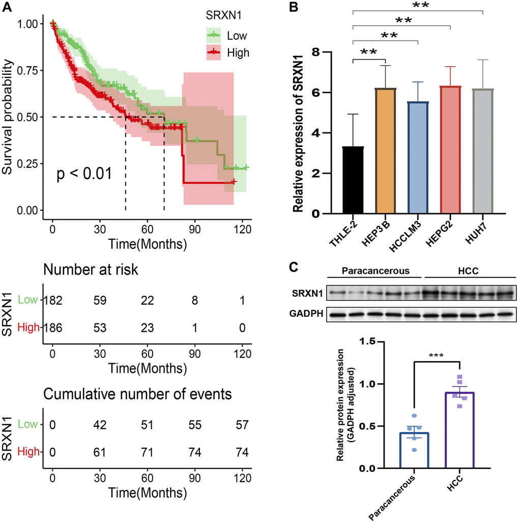 To validate the risk-scoring model in HCC, we first conducted a survival analysis to identify SRXN1 with prognostic significance in the TCGA cohort (Figure 11A). Next, we examined one of the previously identified SRXN1 mRNA that constructs predictive model in several tumor cells. The result of the Quantitative reverse transcriptase-polymerase chain reaction (qRT-PCR) reveals SRXN1 mRNA levels were increased significantly in all tumor cell lines (Figure 11B). Finally, we examined the protein level of SRXN1 in cells of THLE-2 and HEP3B. Our Western blot results show that the SRXN1 protein level was increased significantly in the tumor cell line (Figure 11C).