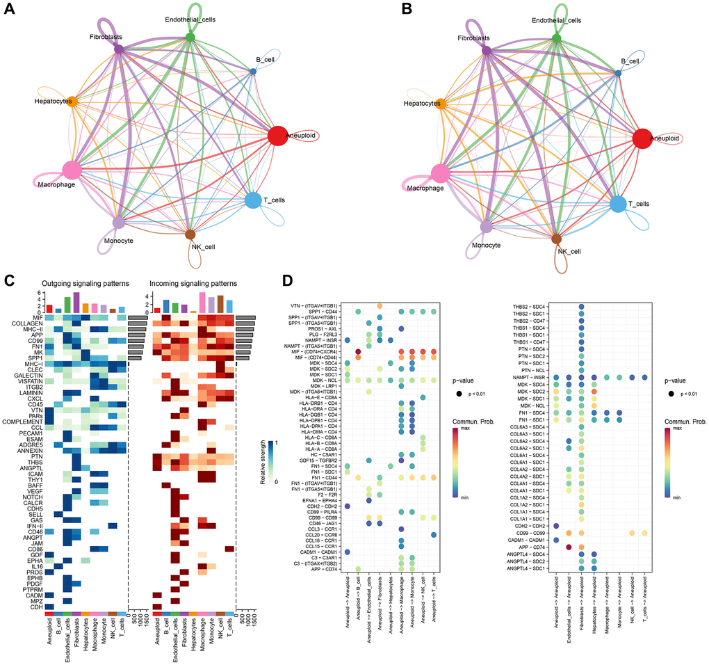 We used copykat to identify malignant cells and analyzed the intersubpopulation communication network using the CellChat (version 1.5.0) package. Results showed that the communication between malignant cells and macrophages had the highest number and intensity (Figure 2A, 2B). Additionally, visual analysis revealed that the first six signaling pathways (MIF, MHC-II, APP, MHC-I) of subgroup communication had signal outputs of malignant cells, with the MIF signaling pathway having the strongest output and Monocyte being the main signal receiver cell (Figure 2C, 2D).