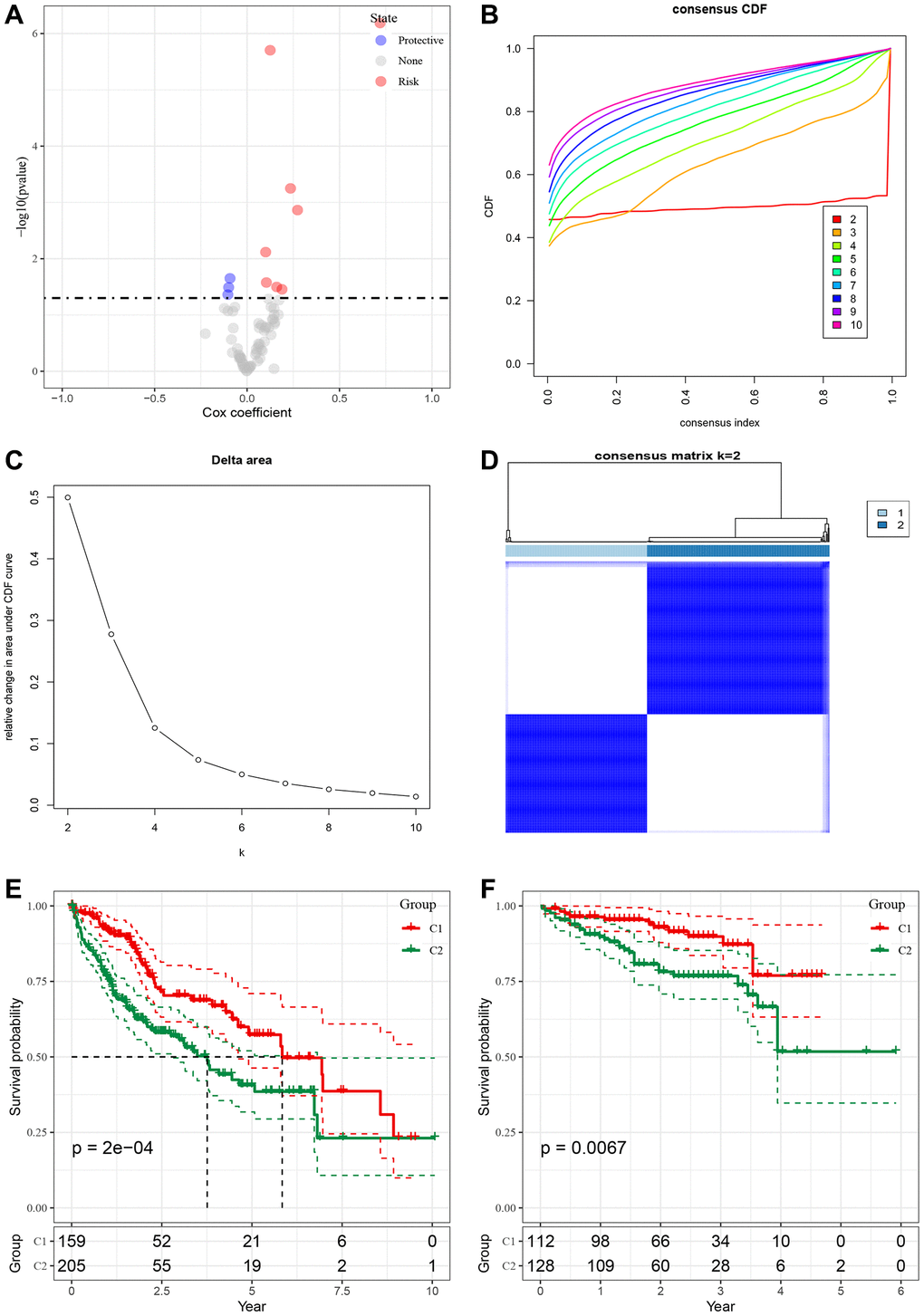 To analyze the role of malignant cell-associated receptors in Bulk RNA-seq data, we screened 72 malignant cell-associated receptor genes using the results of the single-cell dataset CellChat. We found that 7 of the 72 related genes were associated with prognosis (p < 0.05), and protective gene 3 and risk gene 4 are shown in Figure 3A. We observed a relatively stable clustering result for Cluster 2 in the cumulative distribution function (CDF) Delta area curve (Figure 3B, 3C) and selected K = 2 to obtain two molecular subtypes (Figure 3D). Furthermore, analysis of the prognostic characteristics of these two molecular subtypes revealed a significant difference in prognosis (Figure 3E), with intersecting clust2 and clust1 subtypes having worse prognosis. The tcga. Subtype. CLI. Txt contains data for the TCGA dataset subtype. We performed the same clustering method on the independent ICGC-JP dataset and obtained similar results (Figure 3F). The icgc. Subtype. CLI table provides data on subtypes in the ICGC-JP dataset.