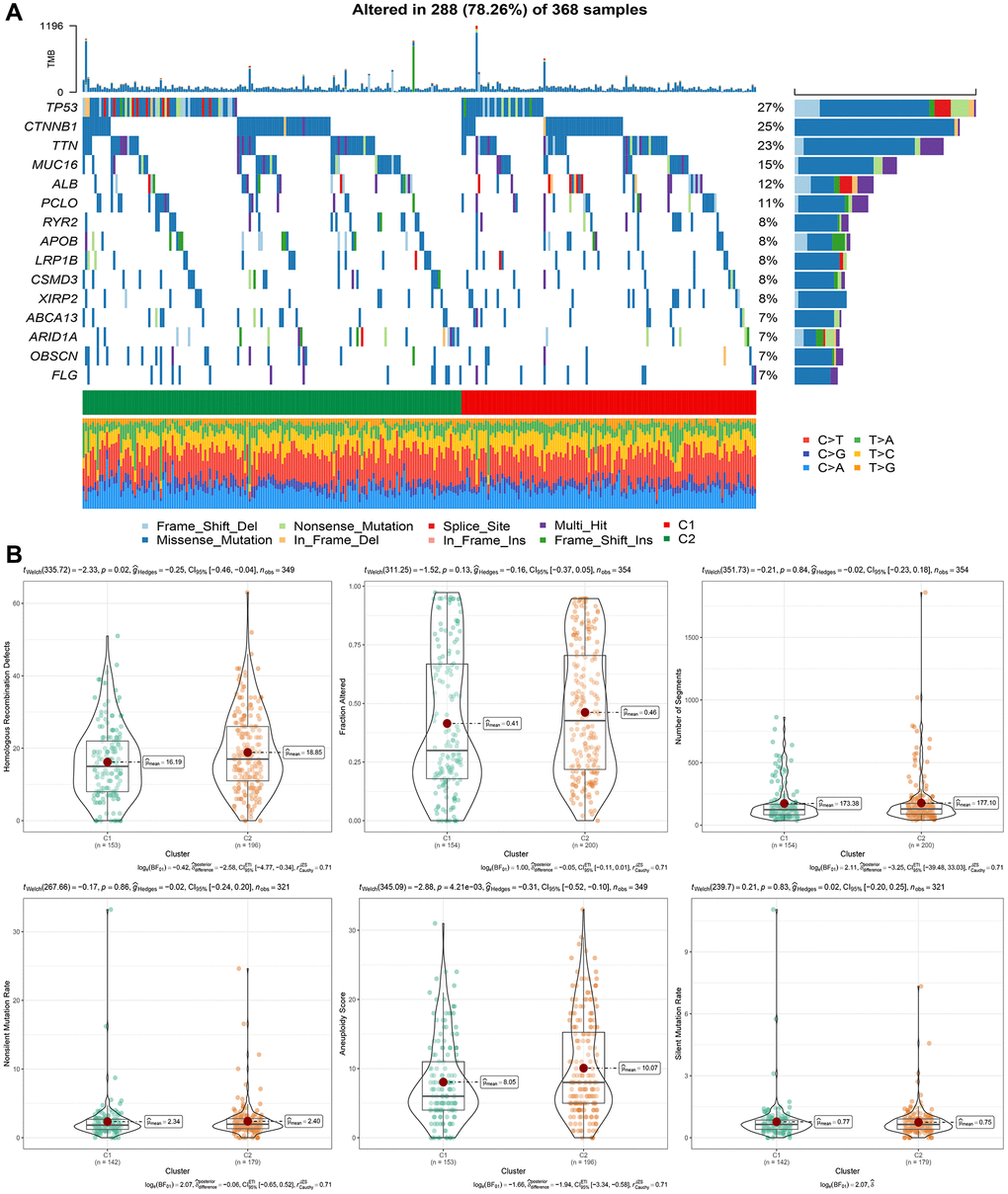 We obtained SNV mutation data from TCGA using Mutect2, as shown in Figure 4A, and presented the top 15 genes with the most significant mutations in each subtype. Moreover, we surveyed “Homologous Recombination Defects”, “Fraction Altered”, “Number of Segments”, “Nonsilent Mutation Rate”, and “Aneuploidy Score,” as well as the distribution of the Silent Mutation Rate. We noticed that the Homologous Recombination Defects and Aneuploidy scores varied between subtypes, as demonstrated in Figure 4B (PMC5982584).