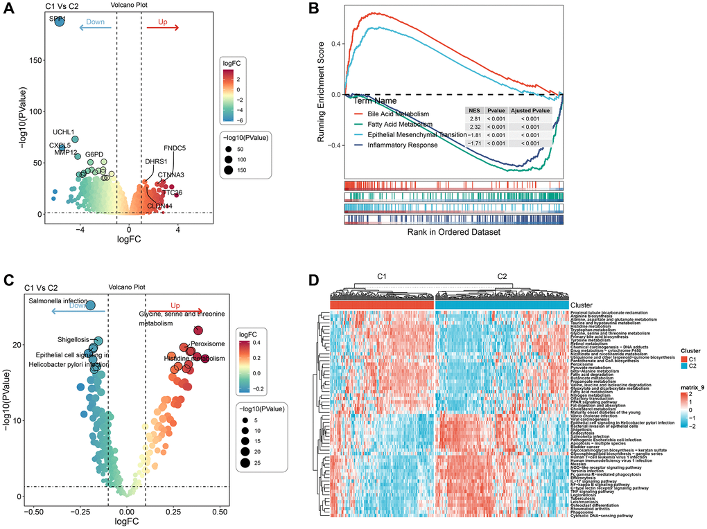 We involved performing differential analysis for TCGA gene expression profiles grouped by cluster subtypes. This analysis revealed that when comparing clust1 to clust2, the expression of 188 genes increased while 1083 genes exhibited decreased expression (Figure 5A). Using the Hallmark gene sets in the Misgbd database as the background set, we performed a difference analysis GSEA (Figure 5B). The analysis results revealed that the Peroxisome and Histidine metabolism were activated in the clust1 subtype, whereas Salmonella infection, Shigellosis, and Epithelial cell signaling in Helicobacter pylori infection were inhibited, as demonstrated in Figure 5C. Our next step utilized GSVA pathway scoring on KEGG pathway enrichment obtained from the Misgbd database. Our analysis showed that 33 pathways were up-regulated and 23 were down-regulated, as demonstrated in Figure 5D.