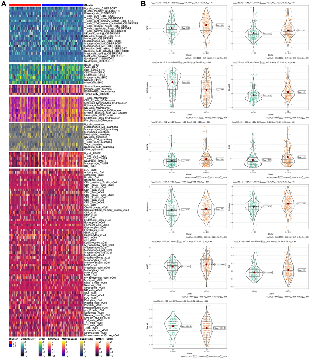 To determine the differences in immune microenvironment among molecular subtypes, we evaluated the infiltration level of immune cells using the expression levels of genes in immune cells in the TCGA cohort. We calculated the scores of immune cells using CIBERSORT, EPIC, Estlmate, MCPcounter, quanTlseg, TIMER, and xCell. Results indicated that the majority of immune cells had noteworthy differences between the two subtypes, with higher scores observed in clust2 (Figure 6A), which indicates that clust2 (with poor prognosis) exhibited a high immune score. We also looked at the expression levels of immune checkpoint genes in the two subtypes and discovered that there were significant variations between the two subtypes, with clust1 having a higher expression level than clust2 (Figure 6B). Patients with high TIDE prediction scores are unlikely to benefit from immunotherapy, indicating a higher probability of immune escape. A Wilcox Test on Figure 6B showed that the TIDE score was highest in the TCGA cohort’s clust2 subtype, suggesting that this subtype has an elevated likelihood of immune escape and is less likely to benefit from immunotherapy.