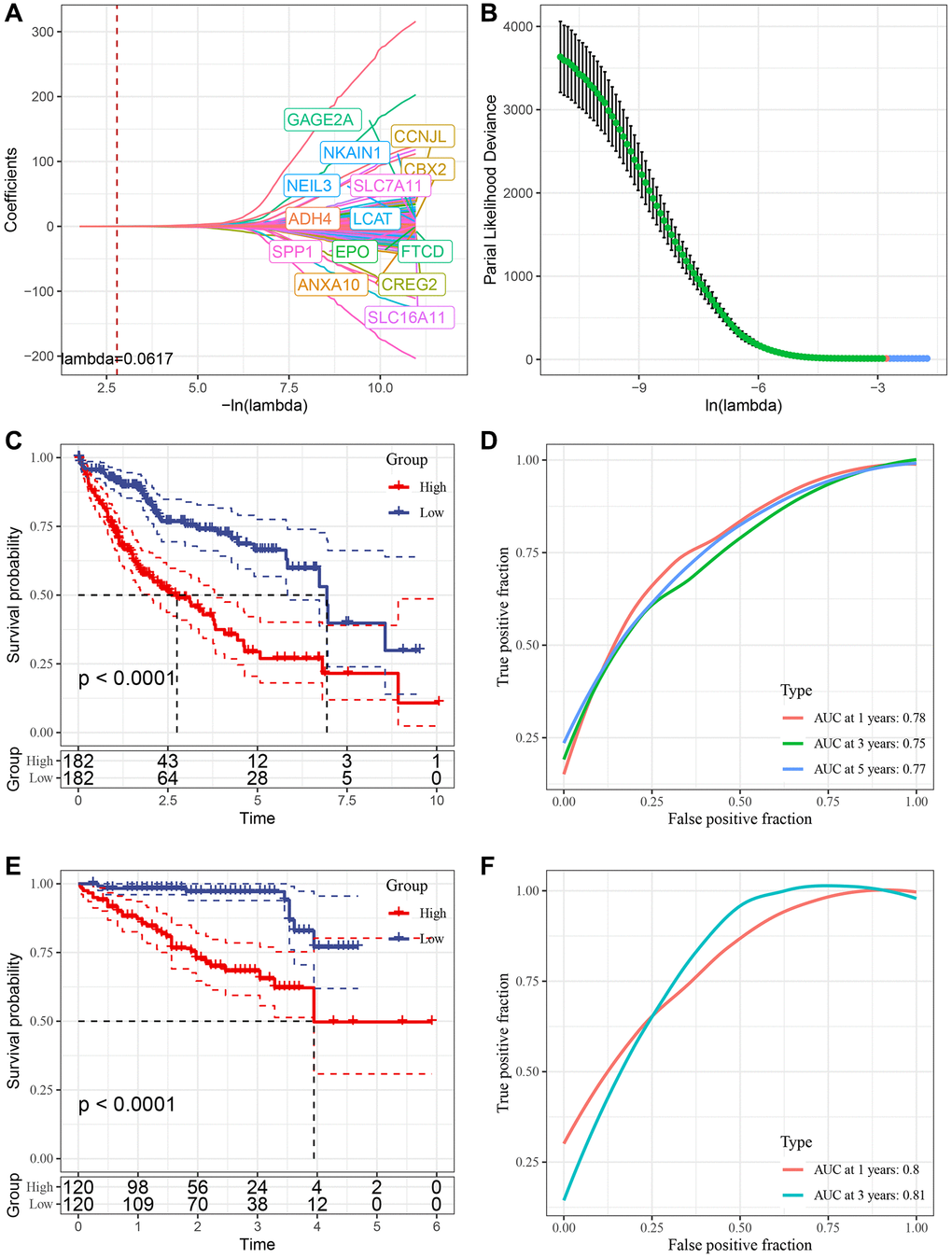 RiskScore = −0.205 × LPCAT1 −0.068 × SLC2A1 −0.194 × NEIL3 + 0.508 × SRXN1 + 0.117 × TRNP 1 + 0.29 × SLC7A11 + 0.209 × STC2 + 0.087 × ZNF239 + 0.25 × CBX2 + 0.111CDCA8 + 0.332EPO + 0.141PON1 + 0.377PBK + 0.186PFN2 + −0.175ACOT12 + −0.052 × ADH4.