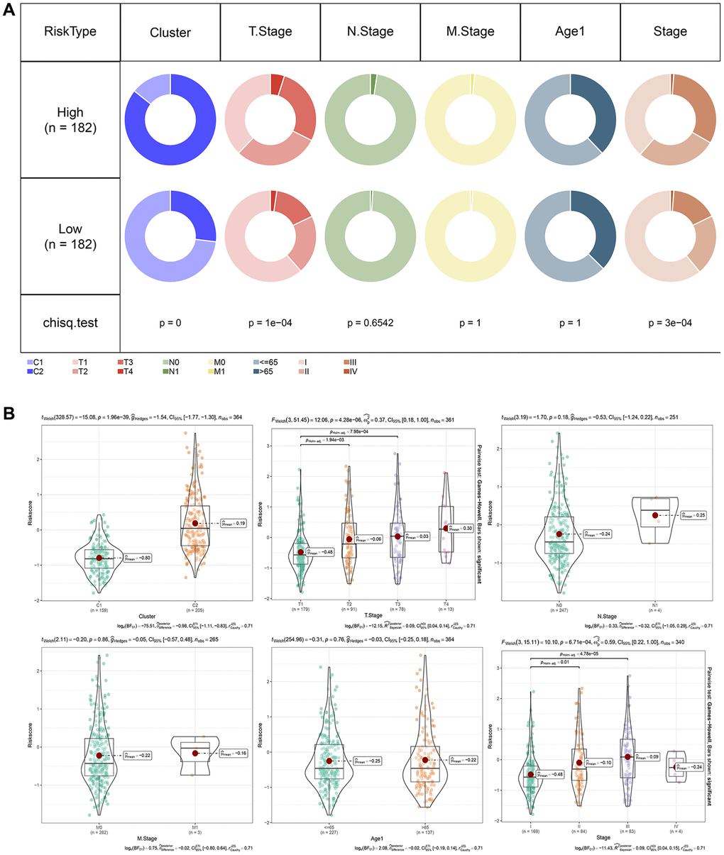 We analyzed the relationship between RiskScore scores and tumor clinical characteristics by studying the differences in scores between various clinical phenotypes in the TCGA dataset (Figure 8A). The findings revealed that the risk score increased with clinicopathological characteristics such as clinical grade, as indicated in Figure 8A, 8B.