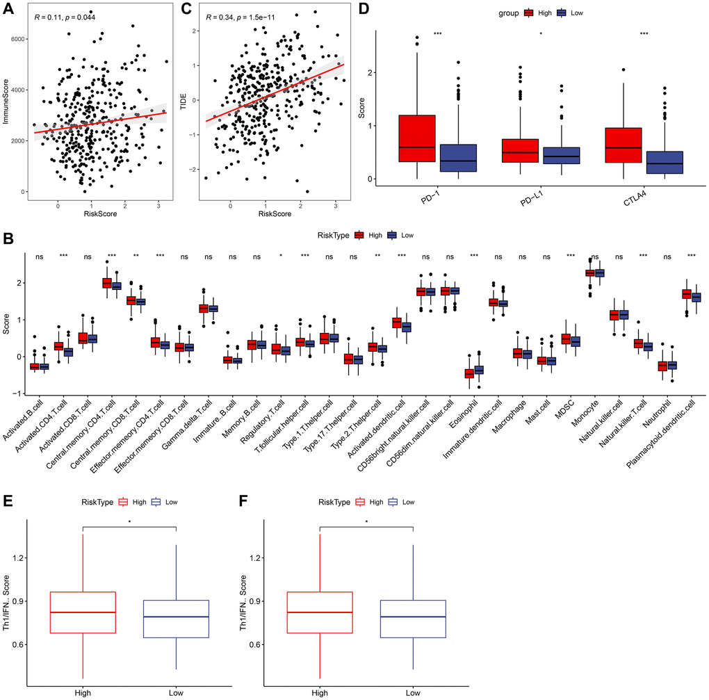 To further investigate the relationship between RiskScore and immunity, we used ESTIMATE to predict the immunity score and, employing Spearman’s method, found a significant positive correlation between the immunity score and RiskScore, as depicted in Figure 9A. Then we analyzed the scores of 28 immune cells to determine their association with high and low risk groups, discerning significant differences in the scores of 12 immune cells, as shown in Figure 9B. The results of TIDE prediction score demonstrated that the TIDE score was higher among those with higher risk scores, as indicated in Figure 9C. We also evaluated the expression of checkpoints CTLA4, PD-1, and PD-L1 in the high-risk and low-risk groups, finding that the expression of these immune checkpoint genes was higher in the high-risk group (Wilcox. Test, Figure 9D). We calculated the TRS score using the ssGSEA method based on TRS-associated characteristic genes, discovering that the Risk-High group had a higher TRS score (Wilcox. Test, Figure 9E). Furthermore, we computed the interferon (IFN) score using ssGSEA method and identified the gamma score (Th1/IFNγ score) to be significantly higher in the Risk-high group than in the Risk-low group, as presented in Figure 9F.