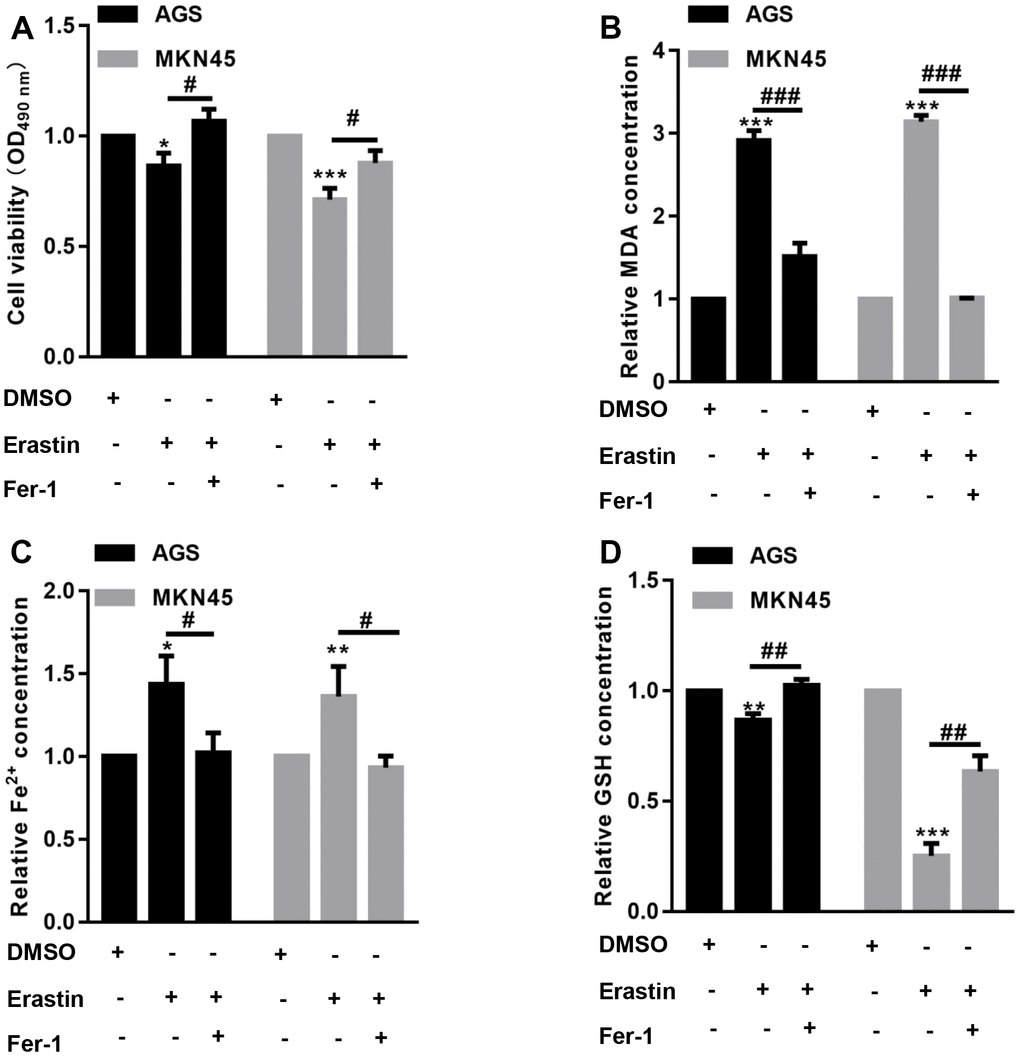 Ferroptosis is a form of cell death mediated by iron-dependent oxidative stress that can be induced by erastin and RSL3 [28]. Here, we first explored whether the two cell lines, EBV-infected AGS and MKN45, were sensitive to ferroptosis. Our data showed that erastin treatment significantly reduced cell viability in EBV-infected AGS and MKN45 cells, but inhibition of ferroptosis via Fer-1 significantly augmented cell viability. Furthermore, erastin also decreased the levels of MDA and Fe2+ in EBV-infected AGS and MKN45 cells. These observations indicated that EBV-infected AGS and MKN45 cells were sensitive to ferroptotic cell death.