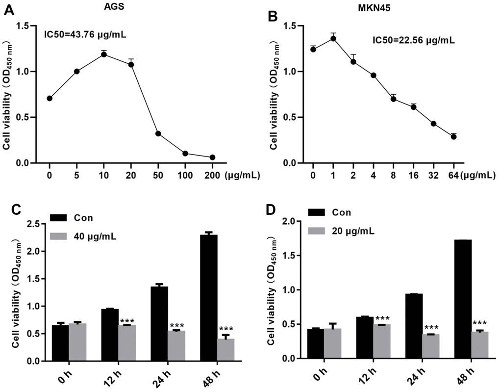 Cell viability was determined using the CCK-8 assay in EBV-infected AGS and MKN45 cells. In brief, EBV-infected AGS and MKN45 cells were seeded in 96-well plates at a density of 3,000 cells/well for 24 h. Then, the cells were incubated with TFP (ST8770, Solarbio, Beijing, China) at a density of 0, 5, 10, 25, 50, 100, and 200 μg/mL and 0, 1, 2, 4, 6, 8, 16, 32 and 64 μg/mL in EBV-infected AGS and MKN45 cells for 24 h, respectively. Then, 10 μL of CCK-8 solution was added to each well for 4 h, and cell viability was determined at OD450 nm by applying an ELISA browser (Bio-Tek EL 800, Winooski, VT, USA).