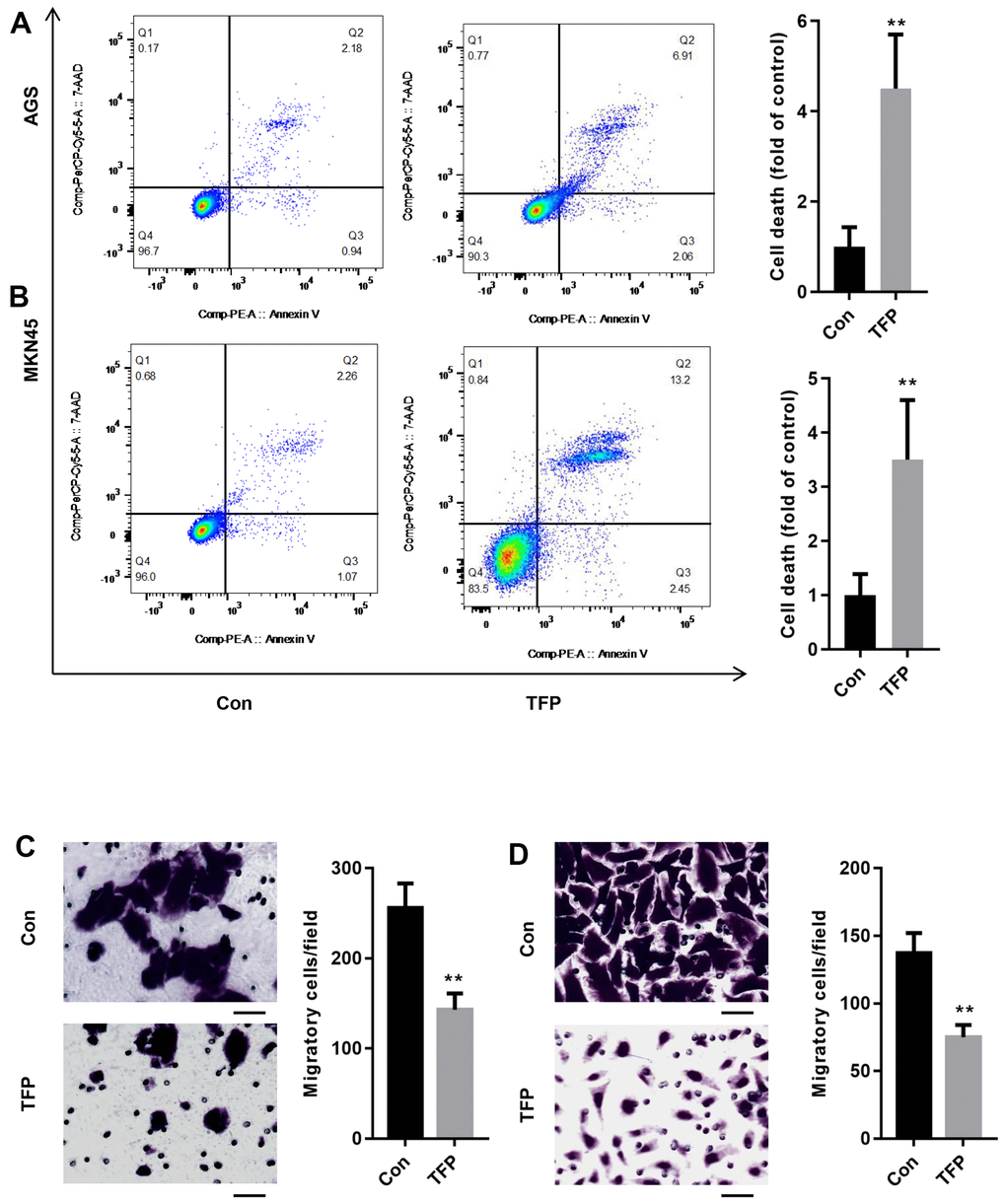 After incubation with TFP for 24 h, the effects of TFP on cell death were explored using flow cytometry. As shown in Figure 3A, 3B, TFP significantly enhanced the number of dead AGS (24.5±3.8 vs. 8.7±2.1) and MKN45 (3.9±2.8 vs. 36.5±5.6) cells compared with the number of dead control cells. Meanwhile, TFP induced a remarkable reduction in the number of migratory AGS (143±18 vs. 256±27) and MKN45 (75±9 vs. 137±15) cells relative to the vehicle-treated controls (Figure 3C, 3D).