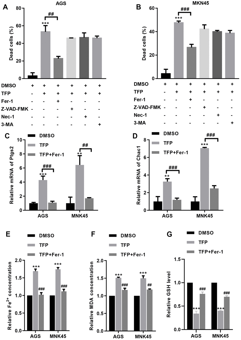 To explore the specific mechanism of TFP-induced cell death, we preincubated EBV-infected AGS and MNK45 cells with different reagents, including Fer-1 (a ferroptosis inhibitor), Z-VAD-FMK (an apoptosis inhibitor), necrostatin-1 (Nec-1, a necrosis inhibitor), and 3-methyladenine (3-MA, an autophagy inhibitor). The CCK-8 assay indicated that TFP elevated EBV- infected AGS and MKN45 cell death by approximately 50% and 47%, but preincubation with Fer-1 reduced TFP-induced cell death to approximately 23% and 26% in EBV-infected AGS and MKN45 cells (Figure 4A, 4B). However, Z-VAD-FMK, Nec-1 and 3-MA did not significantly change TFP-induced cell death in either EBV-infected AGS or MKN45 cells (Figure 4A, 4B). We also tested the effects of TFP on the mRNA levels of Ptgs2 and Chac1, two important ferroptosis markers, in both EBV-infected AGS and MNK45 cells. RT–PCR analysis indicated that the mRNA levels of PTGS2 and Chac1 were increased after TFP treatment, but Fer-1 preincubation abolished these effects in both EBV-infected AGS and MNK45 cells (Figure 4C, 4D). Compared to the control group, the levels of Fe2+ and MDA were enhanced in the TFP-treated group, while preincubation with Fer-1 partially reversed these effects in both EBV-infected AGS and MNK45 cells (Figure 4E, 4F). TFP-induced reduction of GSH could also be abolished by Fer-1 in both EBV-infected AGS and MNK45 cells (Figure 4G). These findings suggested that ferroptosis was a major contributor to TFP-induced cell death.