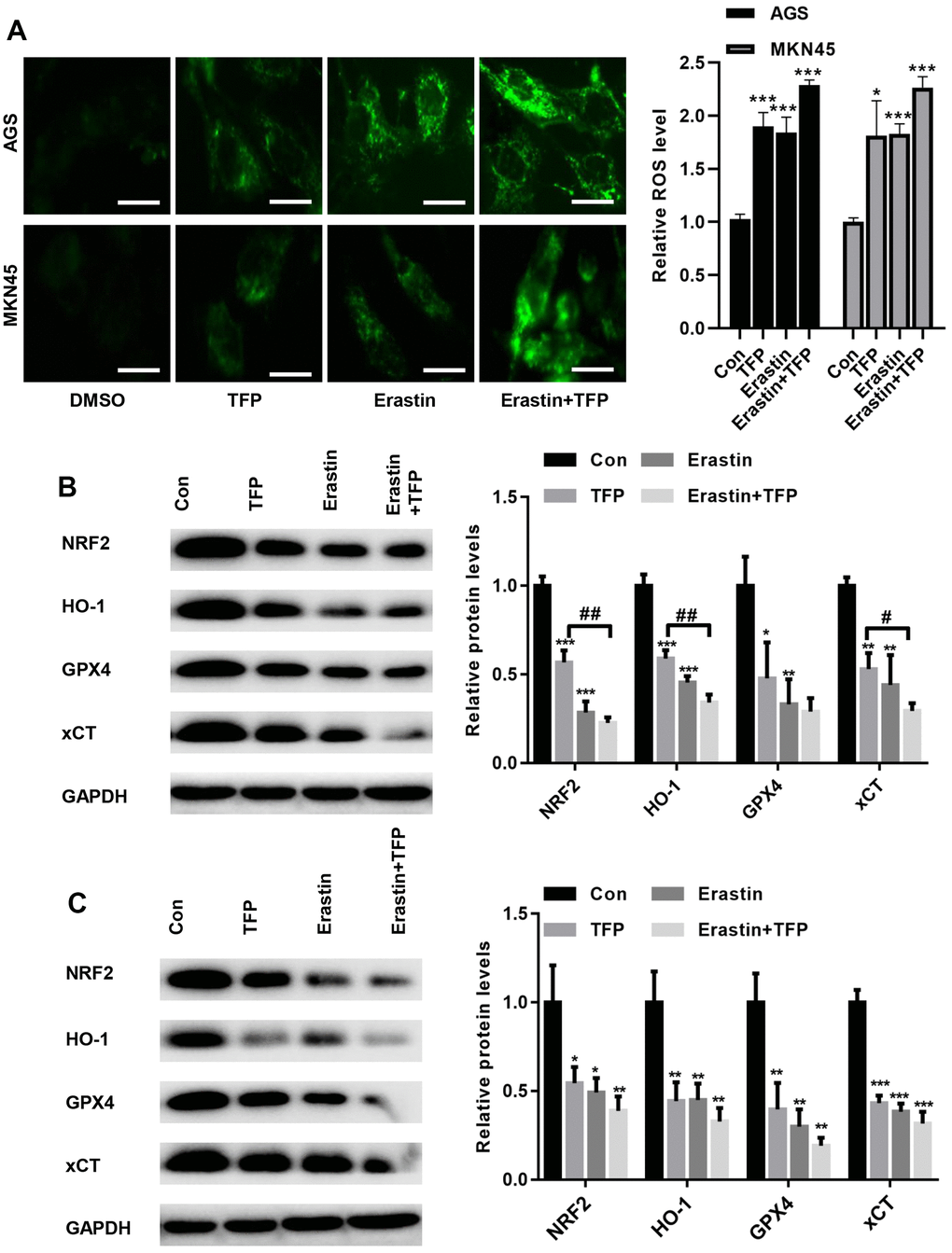 To determine the underlying mechanism by which TFP induces ferroptosis, we tested the effects of TFP on ROS production in EBV-infected AGS and MKN45 cells. DCFH-DA staining showed that TFP treatment promoted ROS accumulation in EBV-infected AGS and MKN45 cells (Figure 5A). Consistently, erastin also induced ROS production in both EBV-infected AGS and MKN45 cells (Figure 5A). Moreover, cotreatment with TFP and erastin demonstrated a synergistic effect in EBV-infected AGS and MKN45 cells (Figure 5A). Studies have indicated that NRF2/HO-1 signaling plays a key role in ferroptosis in gastric cancer [24, 25]. Western blot assays showed that TFP significantly suppressed the expression of NRF2, HO-1, GPX4 and xCT in both EBV-infected AGS and MKN45 cells (Figure 5B, 5C). Consistently, the combination of TFP and erastin also decreased the expression of HO-1, GPX4 and xCT in both EBV-infected AGS and MKN45 cells (Figure 5B, 5C).