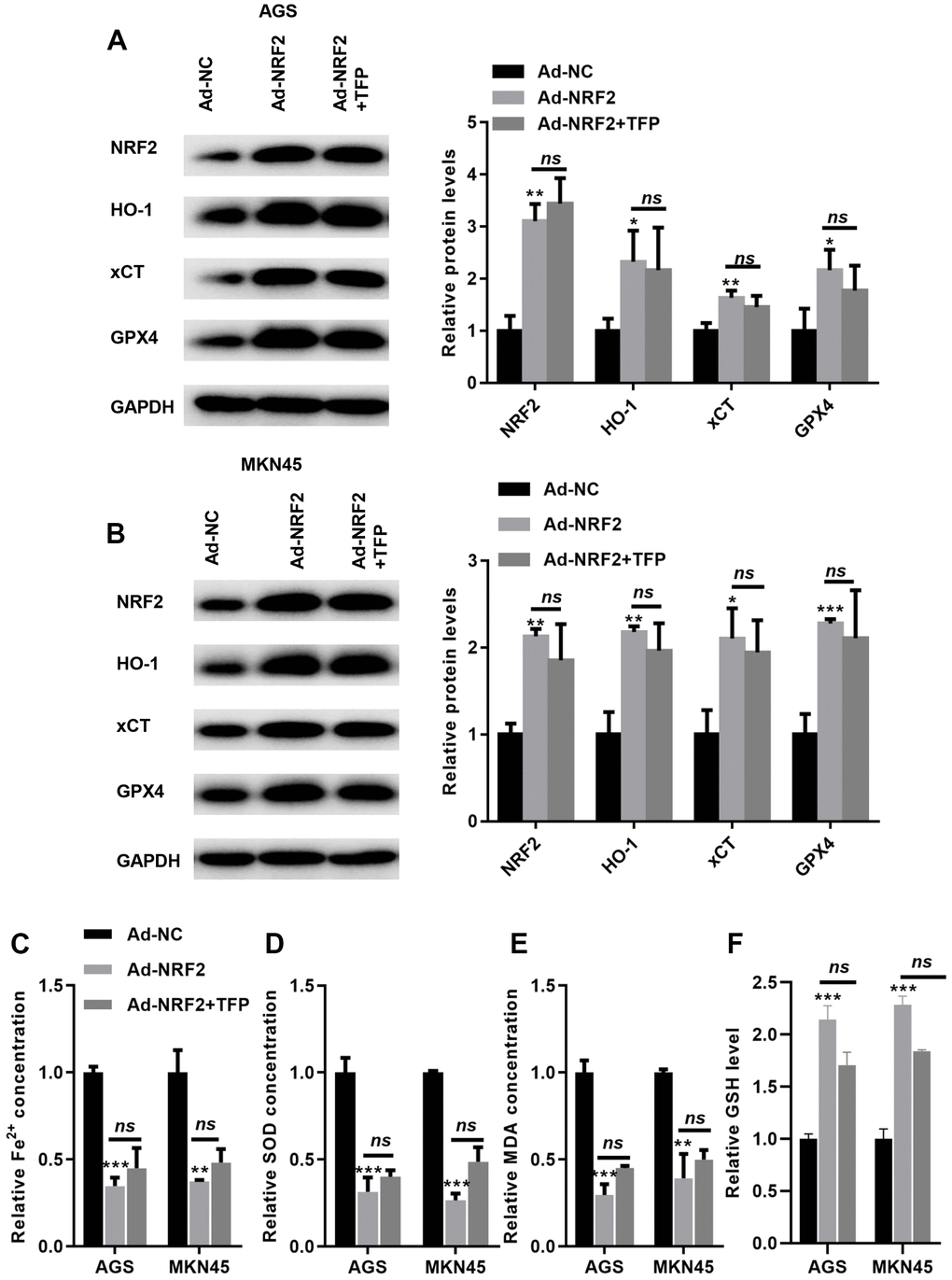 We then overexpressed NRF2 in EBV-infected AGS and MKN45 cells. As shown in Figure 6A, 6B, transfection with ad-NRF2 significantly elevated the expression of NRF2 compared with that of ad-NC in EBV-infected AGS and MKN45 cells. Furthermore, upregulation of NRF2 elevated the expression of HO-1, GPX4 and xCT in EBV-infected AGS and MKN45 cells (Figure 6A, 6B). Meanwhile, the suppression of GPX4 and xCT by TFP was obviously rescued by overexpressing NRF2 in gastric cancer cells (Figure 6A, 6B). Furthermore, overexpression of NRF2 reduced intracellular Fe2+, SOD and MDA levels, even in the presence of TFP (Figure 6C, 6D, and 6E). In contrast, elevated NRF2 expression increased the level of GSH, and TFP pretreatment could not affect such effects in EBV-transfected GC cells (Figure 6F). These data indicated that TFP-induced ferroptosis was mediated via NRF2 in EBV-transfected GC cells.