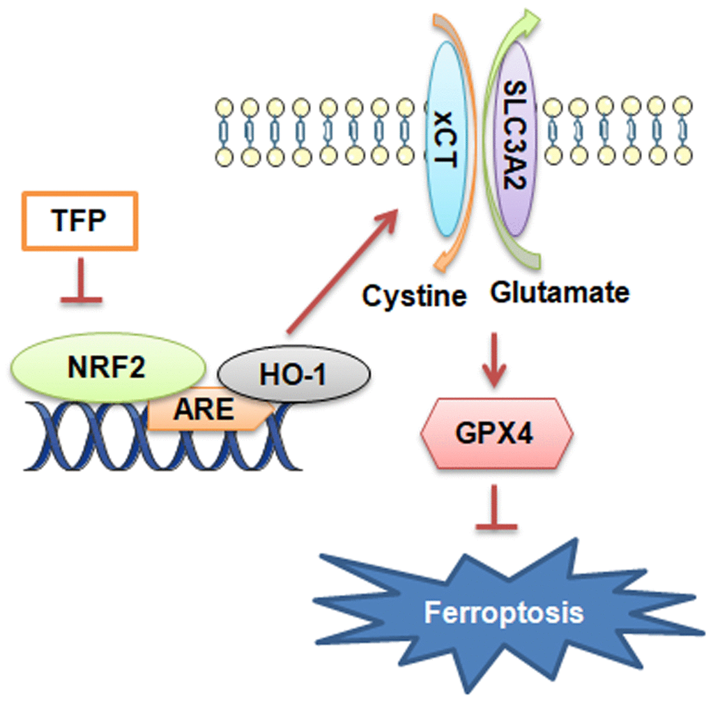 NRF2/HO-1 signaling plays a key role in the endogenous antioxidative stress pathway [19]. Under normal conditions, NRF2 interacts with Keap1 and leads to its degradation [19]. Once oxidative stress is induced, NRF2 dissociates from Keap1 and translocates into the nucleus, thereby activating downstream genes, including HO-1 [36]. Accumulating studies have indicated that HO-1 is a key regulator of ferroptosis, and many drugs have been shown to suppress ferroptosis by activating NRF2/HO-1 signaling [36, 37]. For instance, gastrodin protects HT-22 cells from glutamate-induced ferroptosis by activating NRF2/HO-1 signaling [36]. Moreover, melatonin has also been shown to suppress ferroptosis and enhance the osteogenic capacity of osteoblasts by activating Nrf2/HO-1 signaling both in vivo and in vitro [37]. In this study, the results indicated that TFP suppressed the expression of NRF2, HO-1, GPX4 and xCT in both AGS and MKN47 cells. More importantly, overexpression of NRF2 could obviously rescue TFP-induced downregulation of GPX4 and xCT in gastric cancer cells. An in vivo assay also demonstrated that TFP treatment reduced in vivo tumor weight and volume. Meanwhile, the MDA and Fe2+ levels were decreased by TFP treatment. Western blot assays also showed that the protein levels of NRF2, HO-1, GPX4 and xCT were suppressed by TFP compared with those of controls. These findings suggested that TFP-induced ferroptosis is mainly mediated by inactivating NRF2/HO-1 signaling.