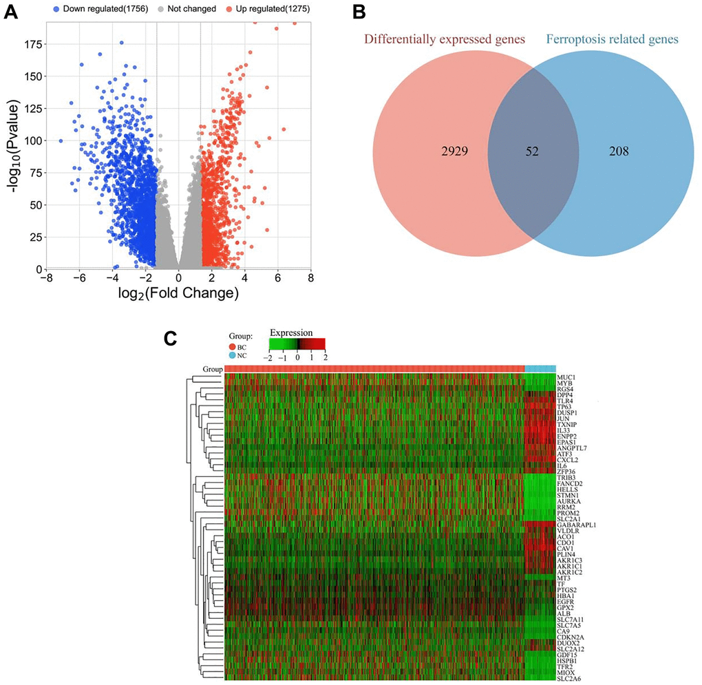 A total of 3031 differentially expressed genes (DEGs) were identified between tumor (BC group) and adjacent tissues (NC group), including 1275 significantly upregulated genes and 1756 significantly downregulated genes (Figure 1A). To further investigate the relationship between DEGs and ferroptosis, the identified DEGs were compared with ferroptosis-related genes downloaded from the Ferroptosis Database (FerrDB). By overlapping the two gene sets, a list of 52 ferroptosis-related DEGs was identified, which may play critical roles in breast cancer (Figure 1B). The expression levels of these ferroptosis-related DEGs are presented in a heatmap (Figure 1C).