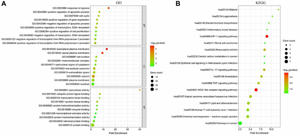 The GO analysis showed that the ferroptosis-related DEGs were mainly involved in biological process (BPs) such as positive regulation of transcription from RNA polymerase II promoter, negative regulation of transcription from RNA polymerase II promoter, and response to hypoxia, as well as cellular components (CCs) such as cytosol, plasma membrane, nucleus, and extracellular exosome. In addition, they were enriched in molecular functions (MFs) such as identical protein binding, protein kinase binding, ubiquitin protein ligase binding, and protein homodimerization activity. These results suggest that the ferroptosis-related DEGs may play important roles in the regulation of transcription, hypoxia response, and protein-protein interactions (Figure 2A).