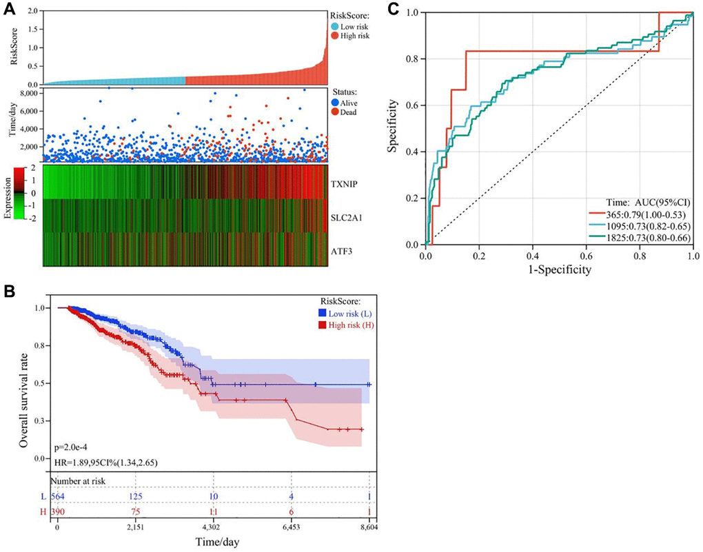 We used multivariate Cox regression analysis to construct a risk score model, which was calculated as follows: RiskScore = SLC2A1 × 0.813354160440223 − TXNIP × 0.473133422604816 − ATF3 × 0.21764547803389237. The survival status plot of breast cancer patients based on the prognostic model is shown in Figure 4A. Based on the risk score of each patient, all tumor samples were divided into high-risk and low-risk groups. The results showed that the overall survival rate of the high-risk group was significantly lower than that of the low-risk group (P < 0.001), as shown in Figure 4B. ROC curve analysis validated the good predictive ability of the prognostic model for survival. The AUC values of the prognostic model for predicting the survival of breast cancer patients at 365 days, 1095 days, and 1825 days were 0.79, 0.73, and 0.73, respectively, as shown in Figure 4C.
