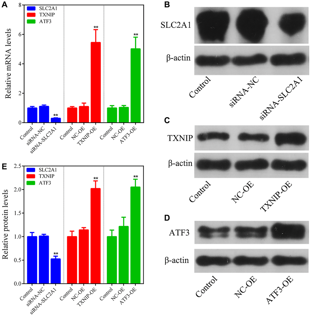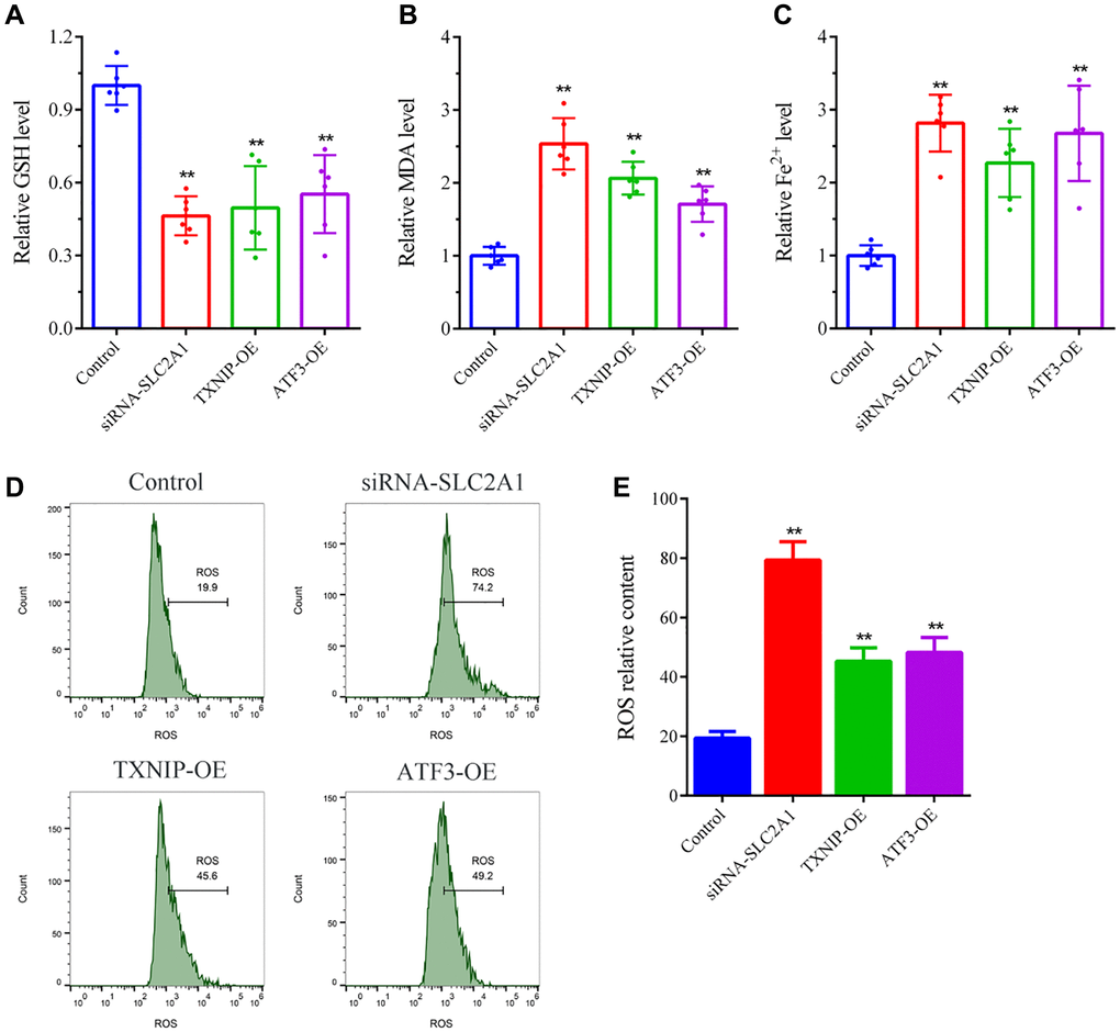 The human breast cancer cell line MCF-7 was purchased from the Cell Bank of the Chinese Academy of Sciences. DMEM medium and fetal bovine serum were purchased from Gibco (Grand Island, NY, USA); Op-timen medium was purchased from Procell Life Science and Technology (Wuhan, China); Lipofectamine 2000 transfection reagent was purchased from Invitrogen (Thermo Fisher Scientific, Carlsbad, CA, USA). Small interfering RNA targeting SLC2A1 (siRNA-SLC2A1), pcDNA-TXNIP overexpression plasmid (TXNIP-OE), and pcDNA-ATF3 overexpression plasmid (ATF3-OE) were designed and synthesized by Sangon Biotech (Shanghai, China); SLC2A1, TXNIP, and ATF3 primers were synthesized by Sangon Biotech (Shanghai, China). Primary antibodies against SLC2A1 (#4393), TXNIP (#13113), and ATF3 (#12691) were purchased from Abcam (Cambridge, UK), and anti-actin was purchased from Proteintech Group (Wuhan, China). HRP-conjugated secondary antibody was purchased from Elabscience Biotechnology (Wuhan, China). BCA protein assay kit was purchased from Elabscience Biotechnology (Wuhan, China). TRIzol reagent, PrimeScript RT reagent Kit, and SYBR Green Master Mix were purchased from Thermo Fisher Scientific (Wilmington, NC, USA). Reactive oxygen species (ROS) and Fe2+ detection assay kits were purchased from Yeasen Biotechnology (Shanghai, China), glutathione (GSH) detection assay kits were purchased from Beijing Solarbio Science and Technology (Beijing, China), malondialdehyde (MDA) assay kits were purchased from Nanjing Jiancheng Biological Engineering Research Institute (Nanjing, China). CCK-8 assay kit was purchased from New Cell and Molecular Biotech (Suzhou, China). GIEMS staining solution was purchased from Gibco (Grand Island, NY, USA).