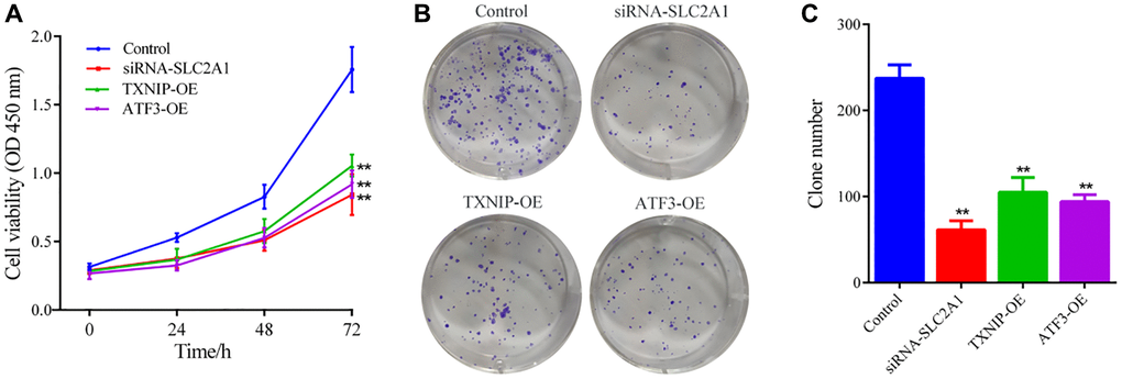 To assess cell proliferation, single-cell suspensions of the Control group and experimental groups (siRNA-SLC2A1, TXNIP-OE, ATF3-OE) were seeded into 96-well plates at a density of approximately 2000 cells per well and incubated at 37°C and 5% CO2 in a cell culture incubator for 24, 48, and 72 h. At each time point, 10 μL of CCK8 working solution was added to each well, and the cells were incubated for 30 min at 37°C. The absorbance (A) was measured at 450 nm wavelength according to the instructions of the CCK8 kit.