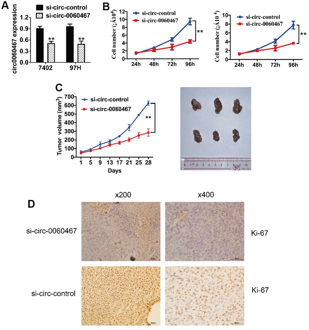 To assess the roles of circ0060467 in HCC, RNA interference was used to downregulate circ0060467 levels and the successful inhibition was showed by qRT-PCR analysis (Figure 2A). Notably, the suppression of circ0060467 markedly inhibited cell growth (Figure 2B). To evaluate the impact of circ0060467 on in vivo tumor proliferation, a xenograft experiment was conducted. It showed that tumor proliferation was significantly suppressed with inhibition of circ0060467 (Figure 2C). Moreover, immunohistochemical staining of xenograft tumor sections indicated suppression of Ki-67 levels following the inhibition of circ0060467 (Figure 2D).