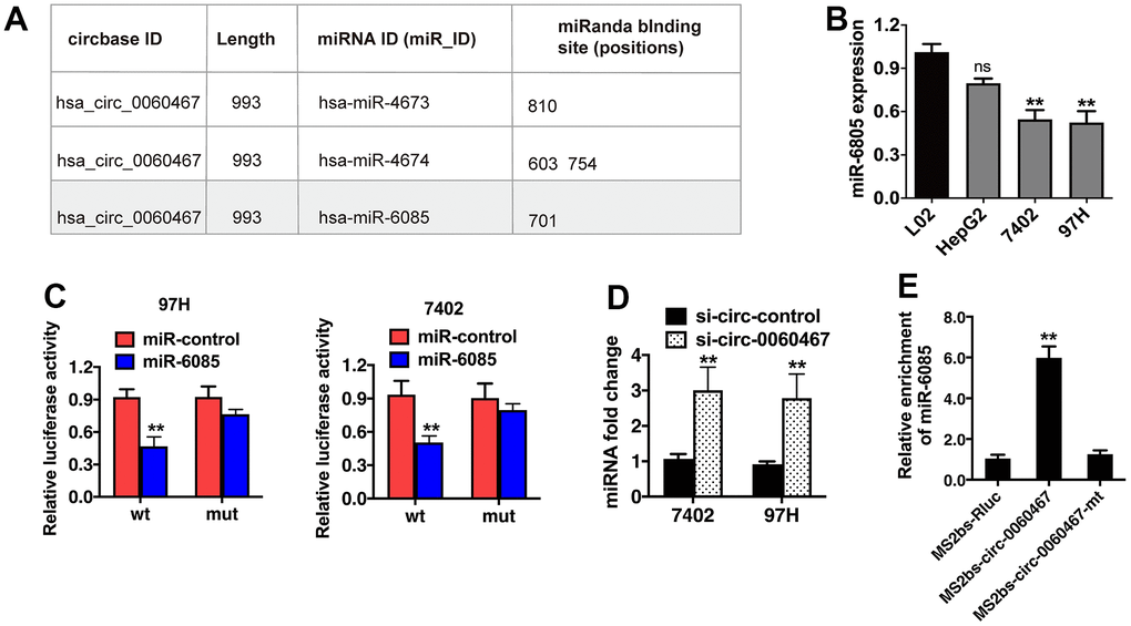 CircRNAs can work as ceRNAs to modulate miRNAs, thereby liberating miRNA-targeted genes. Hence, we evaluated if circ0060467 can function as a miRNA sponge and projected the possible molecular targets of circ0060467 on CircBank (http://www.circbank.cn/). The analysis revealed that the putative binding site for miR-6085 resides within the sequence of circ0060467 (Figure 3A). qRT-PCR analysis demonstrated low expression levels of miR-6085 in HCC cells (Figure 3B). Moreover, co-transfection with miR-6085 mimics led to a suppression of luciferase activity, an effect not observed in cells transfected with the mutant luciferase reporter (Figure 3C). Subsequently, knockdown of circ-0060467 in 7402 and 97h cell lines resulted in a significant increase in miR-6085 expression (Figure 3D). To validate the direct binding between circ0060467 and miR-6085, an MS2bp-MS2bs-based RNA immunoprecipitation (RIP) assay was conducted. MiR-6085 was highly enriched in the MS2bs-circ-0060467 group (Figure 3E), validating the direct associations between circ0060467 and miR-6085. Thus, circ0060467 effectively interacts with miR-6085, serving as a sponge for miR-6085 in the context of HCC.