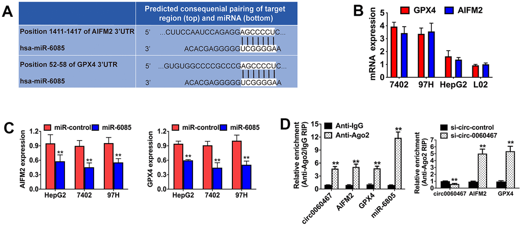 The TargetScan algorithm was employed to investigate the possible downstream targets of miR-6085, revealing AIFM2 and GPX4 as putative target oncogenes (Figure 4A). To confirm the interactions of the predicted targets, expressions of AIFM2 and GPX4 were measured in HCC cell lines and were observed to be elevated (Figure 4B). In addition, miR-6085 mimics significantly inhibited AIFM2 and GPX4 levels in 7402, HepG2, and 97H cells, indicating that AIFM2 and GPX4 were both regulated by miR-6085 (Figure 4C). Then, Argonaute-2 (Ago2) RIP analyses were performed. It was found that circ0060467, AIFM2, GPX4, and miR-6085 were highly enriched in Ago2 complexes. Furthermore, suppression of circ0060467 enhanced AIFM2 and GPX4 enrichment in Ago2 fractions and largely inhibited circ0060467 enrichment in Ago2 complexes (Figure 4D), suggesting that circ0060467 competes with AIFM2 and GPX4 for binding to miR-6085.