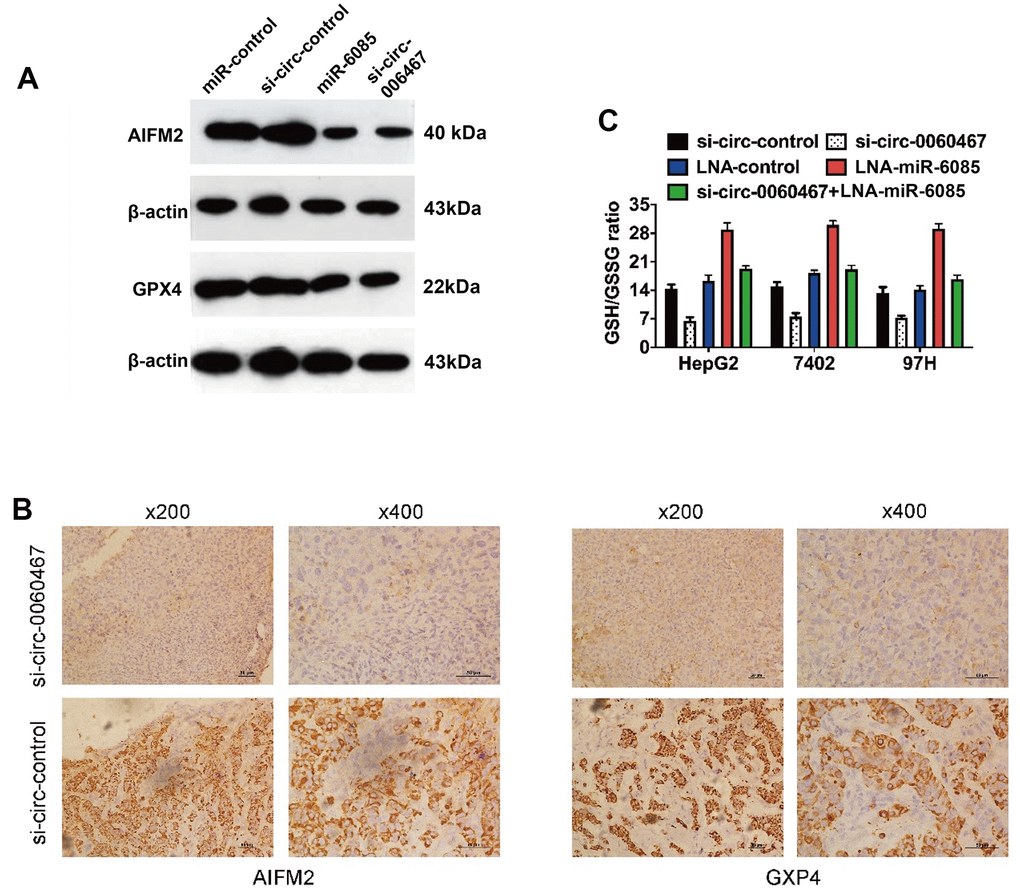 Interestingly, AIFM2 and GPX4 have been determined as vital regulators of tumor cell ferroptosis [22]. Consequently, suppression of circ0060467 enhances cell ferroptosis via the circ0060467/miR-6085/AIFM2 and GPX4 axis. Knockdown of circ0060467 or overexpression of miR-6085, AIFM2, and GPX4 was effective in suppressing 7402, HepG2, and 97H cells (Figure 5A). Additionally, immunohistochemical staining sections of harvested xenograft tumors validated that circ0060467 suppression apparently suppressed the levels of AIFM2 and GPX4 (Figure 5B). Moreover, circ0060467 knockdown led to a decrease in the GSH/GSSG ratio and mitigated GPX4 activation (Figure 5C).