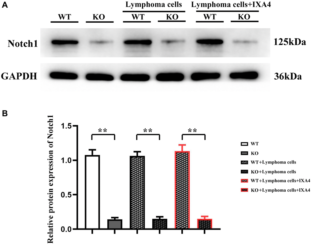 Furthermore, IXA4, an activator of IRE1/XBP1s, was used to clarify whether the activation of IRE1/XBP1s has a regulatory effect on the Notch-1 expression. The results showed that the expression level of Notch-1 in KO + lymphoma cell + IXA4 group remained very low compared with WT + lymphoma cell + IXA4 group (P < 0.01), but was similar to that in KO group (Figure 1). The results suggested that the Notch-1 expression in the bone marrow-derived macrophages of Notch-1 conditional knockout mice is consistently suppressed and remains unchanged regardless of whether they are co-cultured with lymphoma cells and whether IXA4 is used. The findings lay a foundation for further exploration of Notch-1 and its molecular mechanisms.