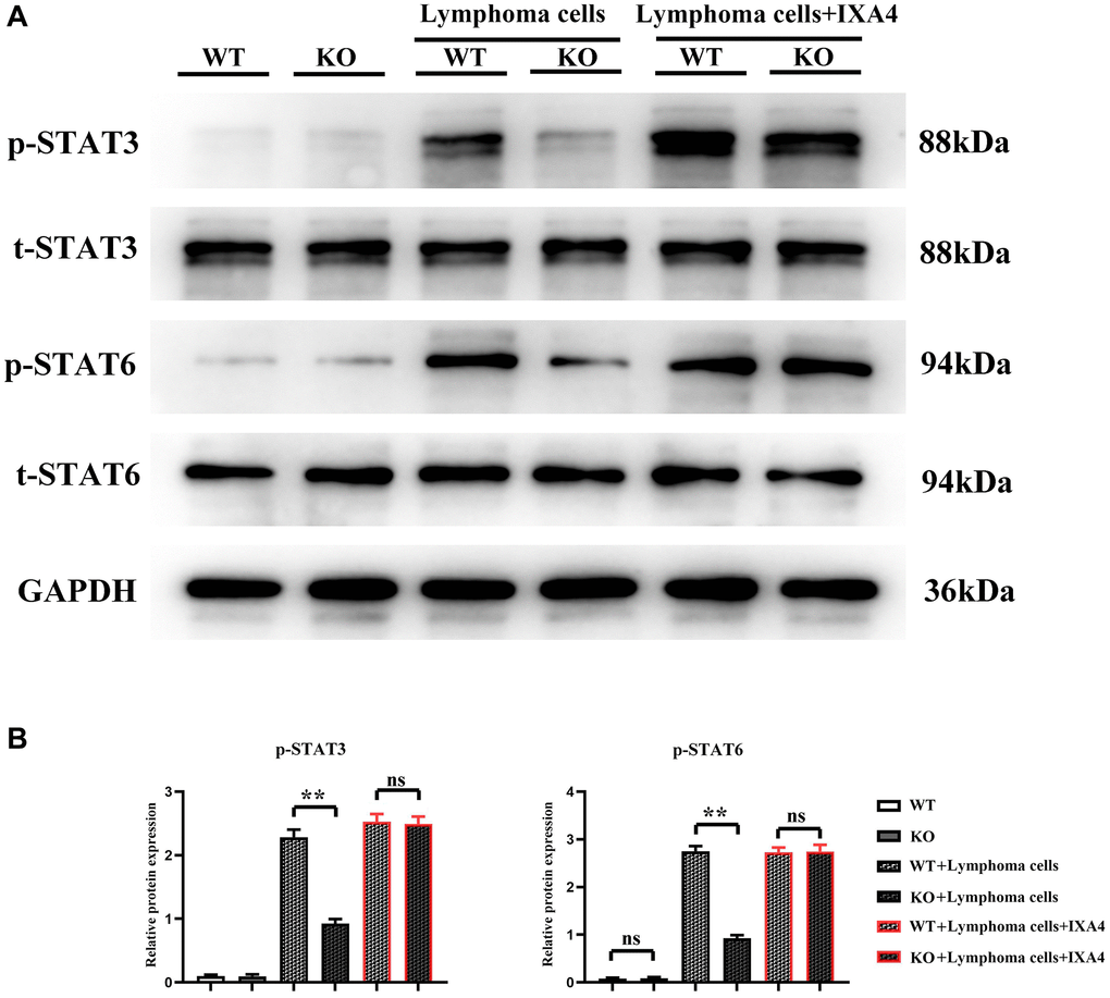 Whether lymphoma cells activate the STAT3/STAT6 signaling pathway in bone marrow-derived macrophages was investigated. It was found that the expression levels of t-STAT3 and t-STAT6 were not different between WT group and KO group, suggesting that the total protein levels of STAT3 and STAT6 are not upregulated at the transcriptional and translational levels after Notch-1 knockout. There was also no difference in the expression levels of p-STAT3 and p-STAT6 between the two groups, suggesting that Notch-1 knockout does not alter the activation levels of STAT3 and STAT6. Compared with WT group and KO group, KO + lymphoma cell group and WT + lymphoma cell group had significantly increased expression levels of STAT3 and STAT6, indicating that lymphoma cells can activate STAT3 and STAT6. The expression levels of p-STAT3 and p-STAT6 in KO + lymphoma cell group were significantly inhibited compared with WT + lymphoma cell group, and their levels only slightly increased compared with WT group and KO group. The results demonstrated that lymphoma cells can activate the Notch-1 downstream STAT3/STAT6 signaling pathway. Besides, IXA4 did not change the expressions of STAT3 and STAT6. In KO + lymphoma cell + IXA4 group, the expressions of activated STAT3 and STAT6 were similar to that in WT + lymphoma group, while the expressions of p-STAT3 and p-STAT6 were significantly higher than those in KO + lymphoma cell group (Figure 2). It can be seen that the activation of IRE1/XBP1s positively activates the STAT3/STAT6 signaling pathway.