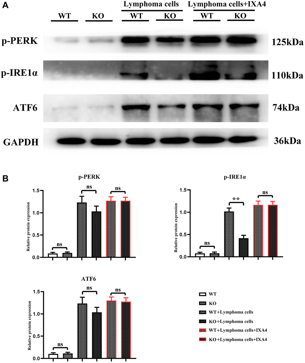 The results showed that in WT group and KO group, p-PERK, p-IRE1α and ATF6 were all lowly expressed, suggesting that the ERS level is low. Compared with WT group and KO group, the expression levels of p-PERK, p-IRE1α and ATF6 were significantly upregulated in WT + lymphoma cell group, indicating that lymphoma cells can simultaneously activate the three oxidative stress pathways. Compared with WT + lymphoma cell group, the expressions of p-PERK and ATF6 slightly decreased and the expression of p-IRE1α was significantly inhibited in KO + lymphoma cell group, proving that p-IRE1α is a key downstream gene of Notch-1, and Notch-1 knockout can significantly block the expression of p-IRE1α. Furthermore, IXA4 was used to activate IRE1α. The results showed that compared with KO + lymphoma cell group, the expression of p-IRE1α was dramatically upregulated in KO + lymphoma cell + IXA4 group, but there was no significant difference in the expression levels of p-PERK and ATF6 (Figure 3). To sum up, IXA4 can activate the IRE1α signaling pathway but has no impact on the other two ERS signaling pathways.
