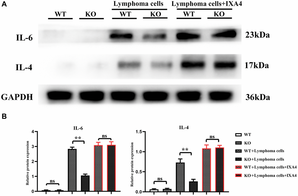 The expression levels of IL-4 and IL-6 were low in WT group and KO group, but they significantly increased in WT + lymphoma cell group, suggesting that lymphoma cells can activate IL-4 and IL-6 in bone marrow-derived macrophages. The expressions of IL-4 and IL-6 in KO + lymphoma cell group were significantly inhibited compared with WT + lymphoma cell group, demonstrating that Notch-1 is a key upstream molecule regulating the expressions of IL-4 and IL-6. When IXA4 was used, the expressions of IL-4 and IL-6 were upregulated in WT + lymphoma cell + IXA4 group compared with WT + lymphoma cell group. It can be seen that lymphoma cells and IXA4 may interact with each other to promote the expressions of downstream IL-4 and IL-6 (Figure 4). At the same time, Notch-1, although knocked out, activating its downstream IRE1/XBP1s signaling pathway can also significantly upregulate the expressions of downstream IL-4 and IL-6.