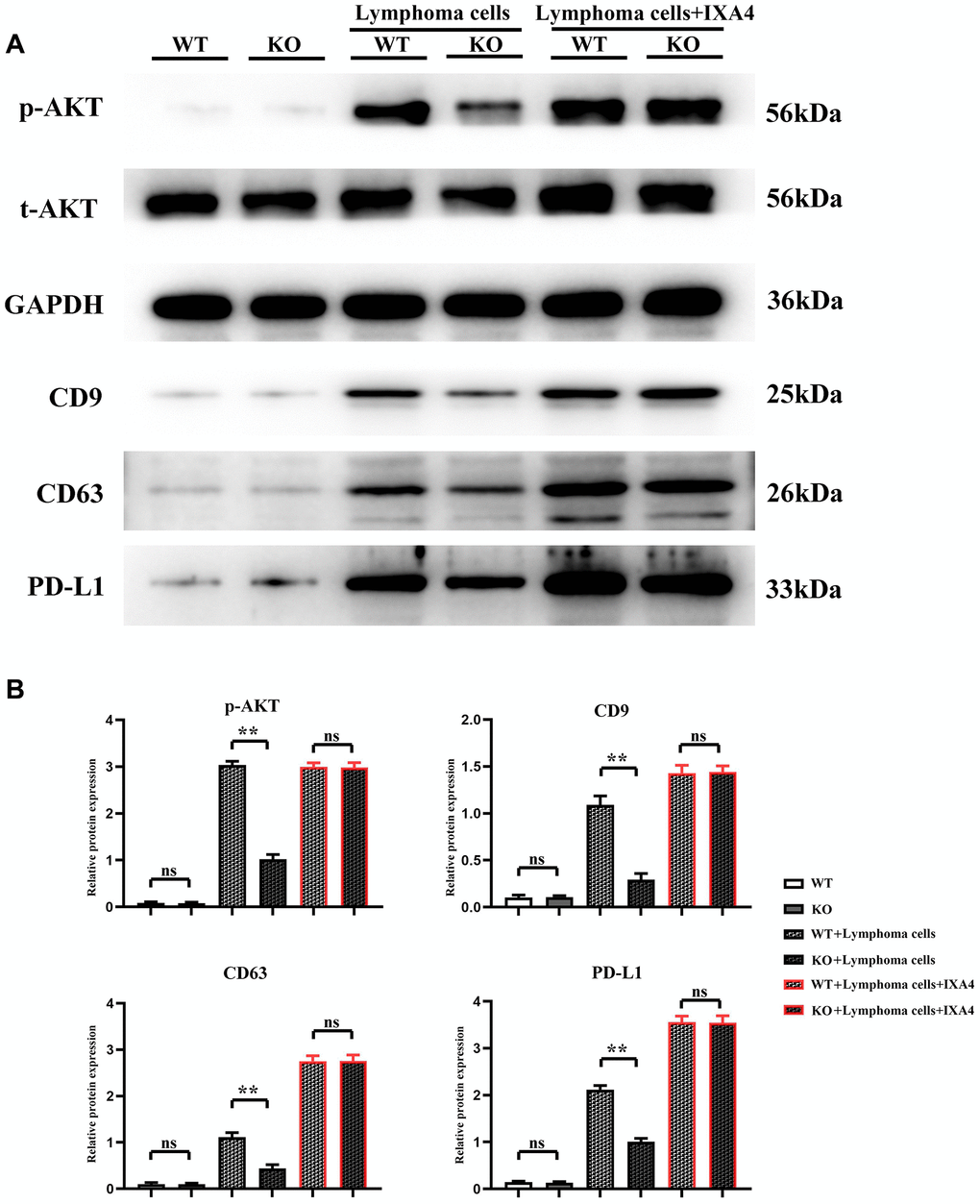 The expression level of p-AKT had no significant difference between WT group and KO group, indicating that Notch-1 knockout does not affect the expression and activation of downstream AKT. At the same time, the expression levels of CD9, CD63 and PD-L1 had no significant difference and remained lower between the two groups, suggesting that Notch-1 knockout does not affect the secretion of PD-L1 by macrophages. Compared with WT group, the expression levels of p-AKT, CD9, CD63 and PD-L1 significantly increased in WT + lymphoma group, suggesting that lymphoma cells can activate the AKT signaling pathway. The expression levels of p-AKT, CD9, CD63 and PD-L1 in KO + lymphoma group were significantly lower than those in WT + lymphoma group, demonstrating that Notch-1 is a key upstream molecule for the activation of AKT pathway in macrophages. Moreover, the expression levels of p-AKT, CD9, CD63 and PD-L1 in WT + lymphoma cell + IXA4 group showed little changes compared with WT + lymphoma cell group, further proving that activation of the IRE1/XBP1s signaling pathway by IXA4 does not activate the downstream AKT signaling pathway. The expression levels of p-AKT, CD9, CD63 and PD-L1 in KO + lymphoma cell + IXA4 group were significantly higher than those in KO + lymphoma cell group but similar to those in WT + lymphoma cell group and WT + lymphoma cell + IXA4 group, proving that IRE1/XBP1s is an important pathway downstream of Notch-1 (Figure 5). To sum up, IRE1/XBP1s is a major Notch-1 downstream pathway that regulates the secretion of PD-L1-containing exosomes, and its activation will significantly enhance the ability of macrophages to secrete PD-L1-containing exosomes.