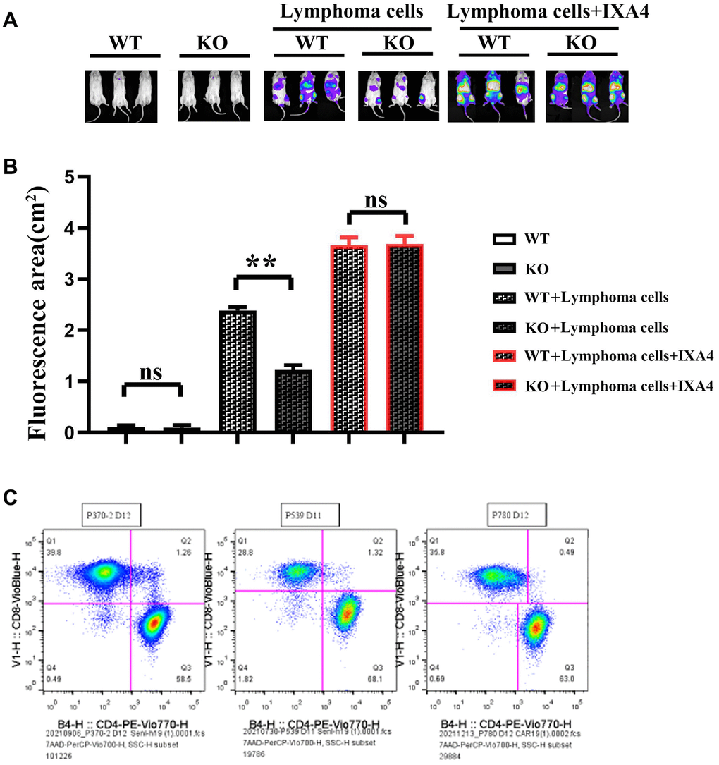 Lymphoma models were established by Raji-Luc-GFP cell injection into immunodeficient mice. The results showed that there was no fluorescence in nude mice in WT group and KO group. The fluorescence area significantly decreased in KO + lymphoma cell group compared with WT +lymphoma cell group, while it significantly increased in KO + lymphoma cell + IXA4 group compared with WT + lymphoma cell + IXA4 group, without significant differences (Figure 6).