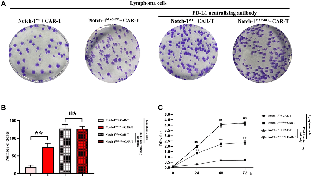 To further explore the effect of Notch-1 knockout on CAR-T cells, colony formation assay and CCK8 assay were performed. The results showed that the cell proliferation capacity and the number of colonies were significantly inhibited in WT + lymphoma cell + CAR-T group, but they were significantly improved in KO + lymphoma cell + CAR-T group. PD-L1 neutralizing antibody significantly restored the cell proliferation capacity (Figure 7). The findings proved that the activation of the Notch-1 signaling pathway can suppress the CAR-T cell proliferation, and Notch-1 knockout or PD-L1 neutralizing antibody can significantly restore the proliferation capacity of CAR-T cells.