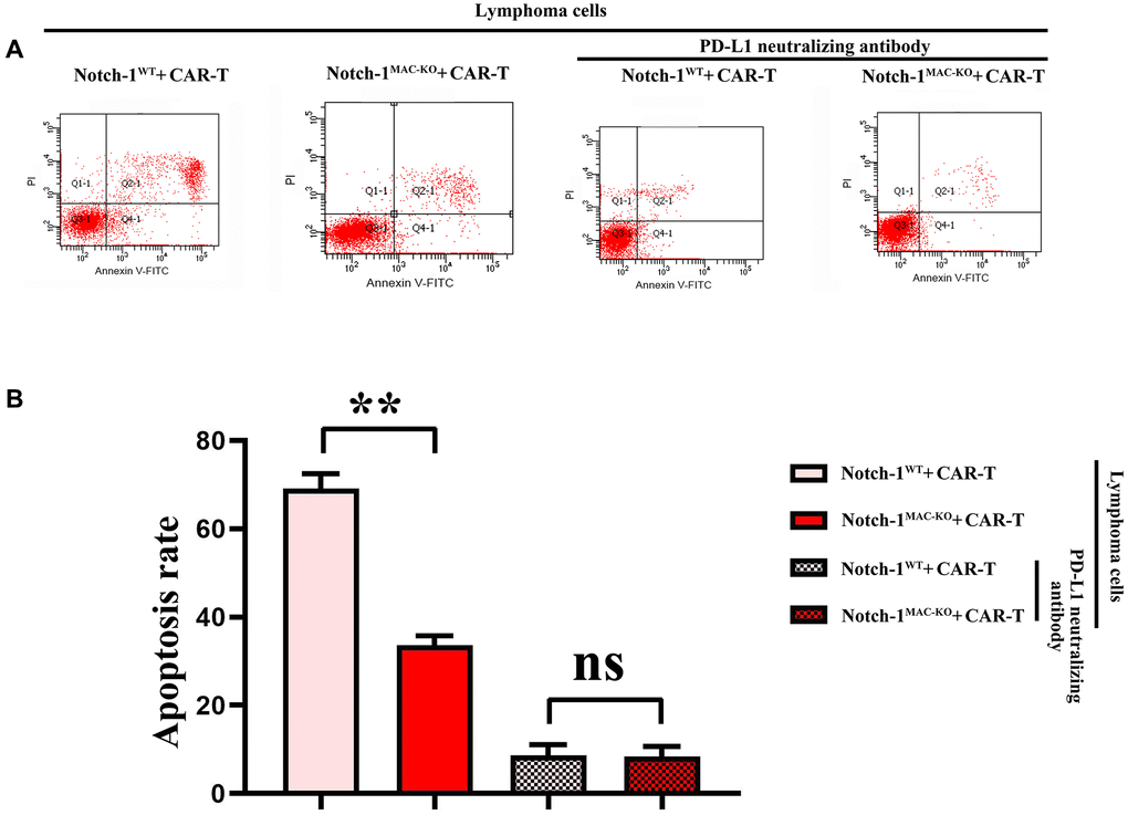 Furthermore, the effect of Notch-1 knockout on apoptosis of CAR-T cells was detected using flow cytometry. The results showed that the number of apoptotic cells increased significantly in WT + lymphoma cell + CAR-T group, and decreased significantly in KO + lymphoma cell + CAR-T group. After the PD-L1 neutralizing antibody was used, the level of apoptosis reached the bottom (Figure 8). The results demonstrated that the activation of the Notch-1 signaling pathway in macrophages can enhance the apoptosis of CAR-T cells, and Notch-1 knockout or PD-L1 neutralizing antibody can significantly inhibit the apoptosis of CAR-T cells. To sum up, all the above findings indicate that lymphoma cells activate the Notch-1/IRE1/XBP1 signaling pathway in macrophages and promote the secretion of IL-6, IL-4 and PD-L1, thus inhibiting the activity and proliferation of CAR-T cells and promoting their apoptosis.