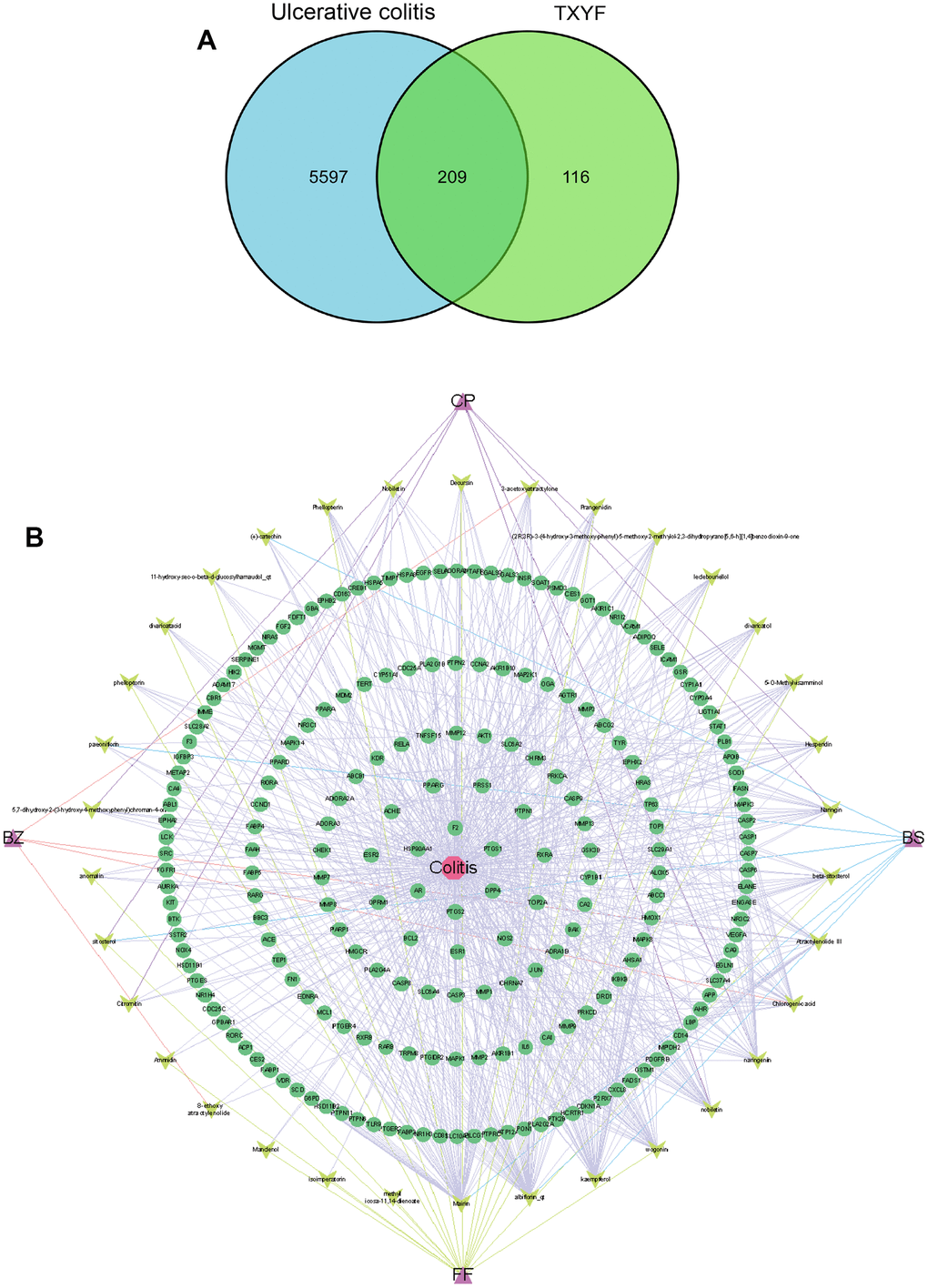 Firstly, the 42 active ingredients in TXYF (Table 1) were obtained from TCMSP, TCMID database (screening criteria OB ≥ 30% and DL ≥ 0.18), and Pharmaceuticals (screening criteria: GI absorption=high, Druglikeness ≥ 2 yes). The total of 325 targets of Traditional Chinese Medicine was retrieved through TCMSP and TCMID database. Secondly, the UC-related genes were downloaded from Gene Card and OMIM databases, and targets with a score greater than the median are set as potential disease targets. Combining the relevant targets retrieved from the OMIM database, the duplicate values were deleted after merging, resulting in 5806 UC-related targets. Thirdly, the 209 common targets in-between 325 targets of TXYF and 5806 UC-related targets were obtained, which can be seen in Figure 1A.