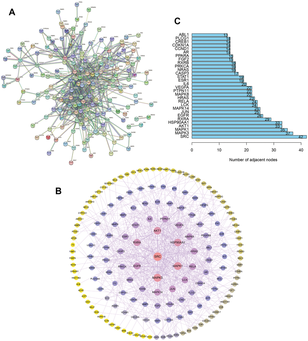 Thereafter, the 209 common targets were uploaded to the STRING database to set the confidence level to be ≥ 0.9, and the interaction network diagram was obtained (Figure 2A). Then, the protein-protein interaction (PPI) network was constructed by Cytoscape (Figure 2B). The larger the node calculated in PPI network, the greater the degree value. According to Figure 2C, the targets at the center of the network include SRC, MAPK, AKT1, etc., were important targets for the treatment of UC with TXYF.