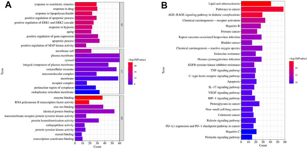 R software (https://www.r-project.org/) and its backend database org.Hs.eg.db were carried to obtain the gene ID (entrezID) of potential targets. Then DOSE, clusterProfiler, and pathview packages (Bioconductor) were utilized to perform GO functional enrichment analysis (Biological Process (BP), Cellular Component (CC) Molecular Function (MF)) based on the potential targets, with screening Criteria of p-value< 0.05 and q-value > 0.05. The top 10 enriched items in the form of bar charts and bubble charts were displayed.