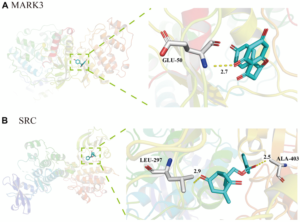 AutoDock Vina was used for molecular docking of active ingredients in TXYF. When the binding energy<-5.0 kcal/mol indicates a good binding activity between the two; When the binding energy<-7.0 kcal/mol indicates strong binding activity between the ligand and the receptor. As presented in Figure 4A, the binding energies of naringin and MAPK was -8.5 (kcal/mol), indicating strong binding activity between the drug and the target. Besides, there was also strong binding energies between albiflorin and SRC (-6.4 kcal/mol) (Figure 4B). These results suggest that the MAPK and SRC are vital target that TXYF active in UC.
