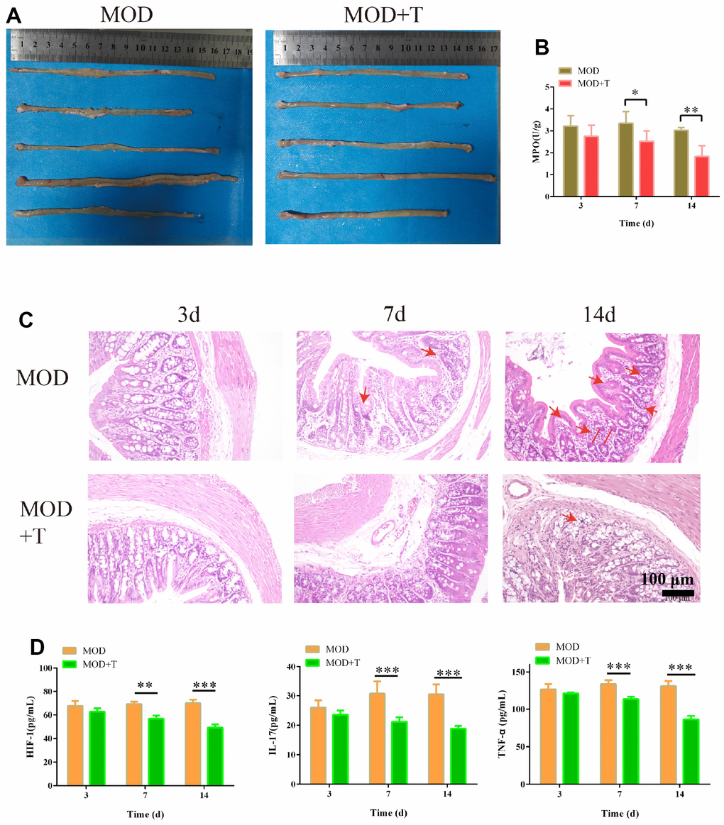 The residual blood was removed from the colon tissue of rats. Colon tissue was weighed, cut into small pieces, and thoroughly grounded onto ice to form a homogenate. Thereafter, the homogenate was placed at 5000 × centrifuge for 10 mins and the supernatant was taken for detection. The following test kits were used for detection according to the instructions: Interleukin-17 (IL-17) test kit (#MM-0088R1, Mlbio, USA); tumor necrosis factor-α (TNF-α) Detection kit (#MM-0180R1, Mlbio); hypoxia inducible factor-1 (HIF-1) detection kit (#MM-70607R1, Mlbio).