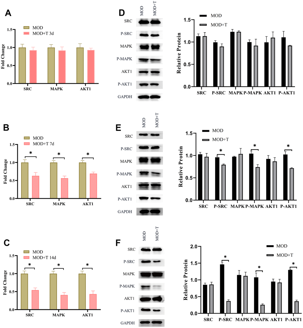 According to our previous results (Figure 2C), the important targets for the treatment of UC with TXYF include SRC, MAPK, AKT1 in the PPI network. Besides, molecular docking of active ingredients in TXYF revealed that strong binding activity between naringin and MAPK, albiflorin and SRC were observed. In the next step, the underlying molecular mechanism of TXYF was further explored. As shown in Figure 6A–6C, the mRNA expression level of SRC, MAPK and AKT1 was significantly decreased with the treatment of TXYF since 7th day the UC model was established. Furthermore, the phosphorylation of SRC, MAPK and AKT1 was also remarkably reduced since 7th day when the UC model rats were treated with TXYF (*p<0.05). These results indicated that TXYF suppresses the phosphorylation of SRC, MAPK and AKT1 in UC.